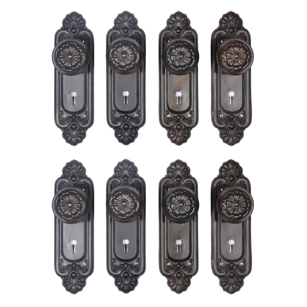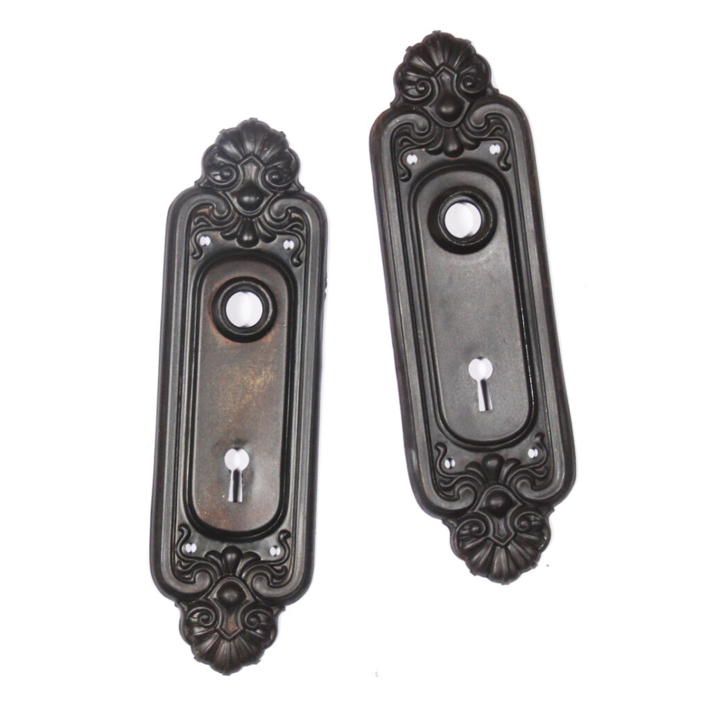 Antique door hardware sets in Norwalk’s “Breton” pattern, circa 1909. These sets of hardware are in very good antique condition with a lovely darkened finish. The door knobs measure 2-1/4” in diameter and 2 1/4” deep; the plates are 2-1/2” by 8-1/8”. Each set includes a pair of doorknobs with the connecting rod and set screws, and a pair of doorplates (enough hardware for one door). THE PRICE LISTED IS FOR EACH SET.