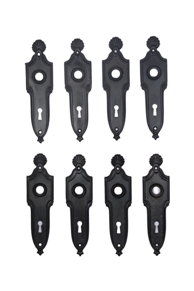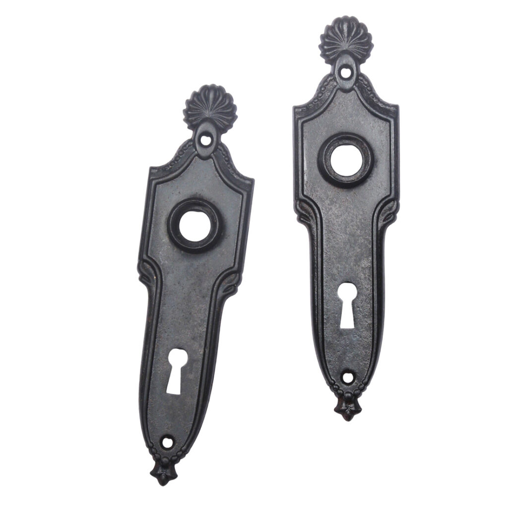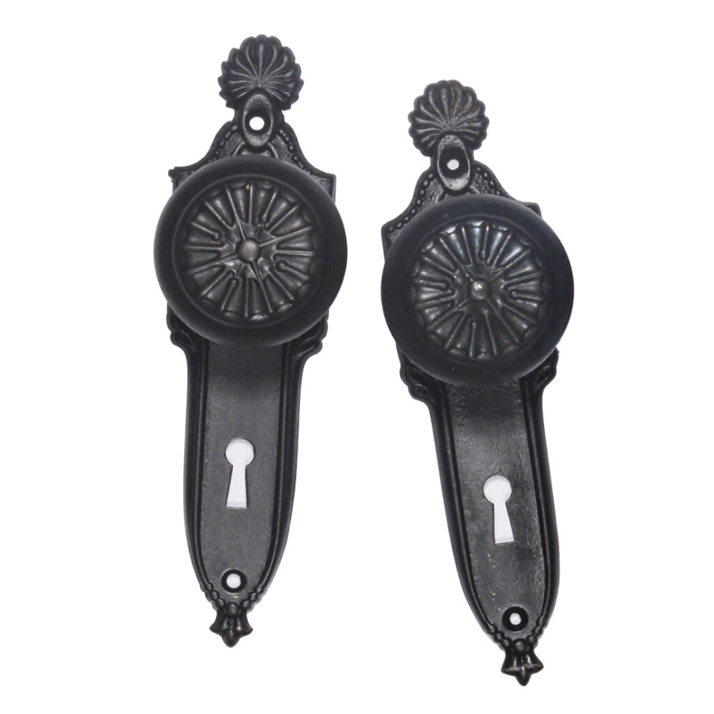 Beautiful antique door hardware sets in Earle Hardware’s “Carlton” pattern, dating from the 1930’s. These doorknob sets feature decorative doorplates with foliate embellishments and coordinating petite knobs. The door knobs measure 2-1/8” in diameter and 2” deep; the plates are 1-3/4” wide, and 6-3/4” tall. Each set includes a pair of doorknobs with the connecting rod and set screws, and a pair of doorplates (enough hardware for one door). THE PRICE LISTED IS FOR EACH SET. If ordering multiple items, please contact us for a combined shipping quote.