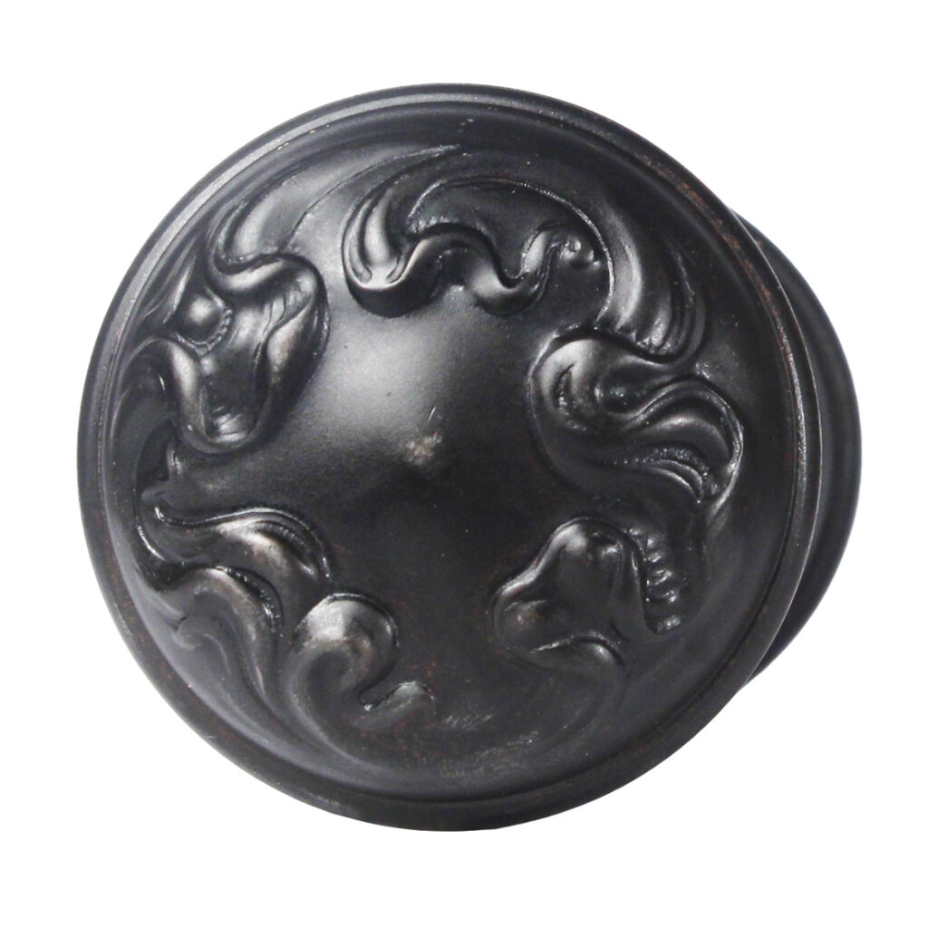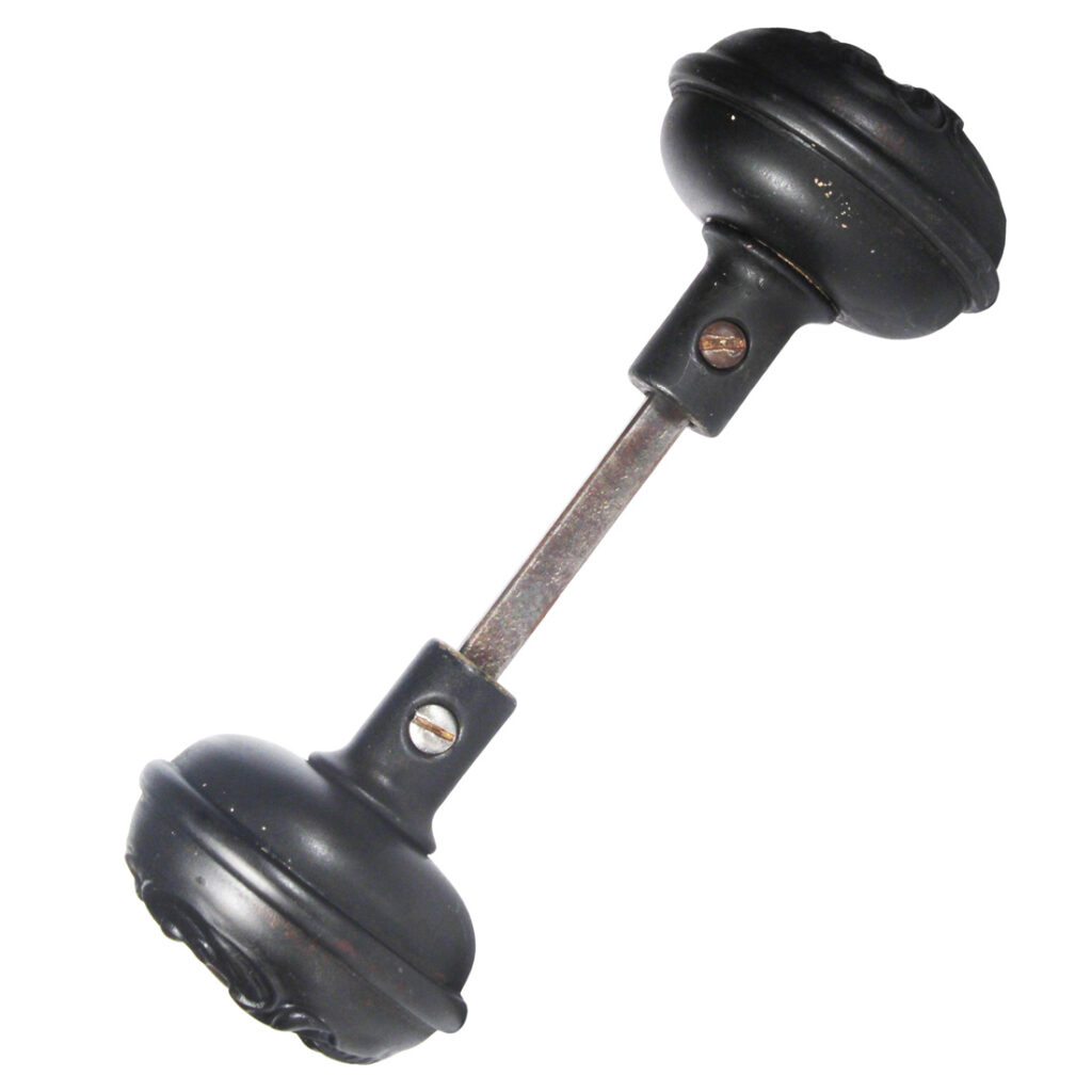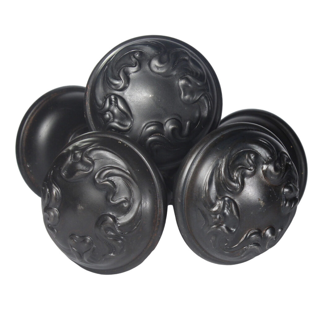 Art Nouveau doorknob sets, made by Sargent in their “Alby” design, dating from the early 1900s. Each knob set is in excellent antique condition, and features a gorgeous darkened patina (as pictured); THE PRICE LISTED IS FOR EACH DOOR KNOB SET – a set includes two knobs, a connecting rod, and two set screws (enough hardware for one door). Each doorknob measures 2-1/4” in diameter and 2-1/8” deep.