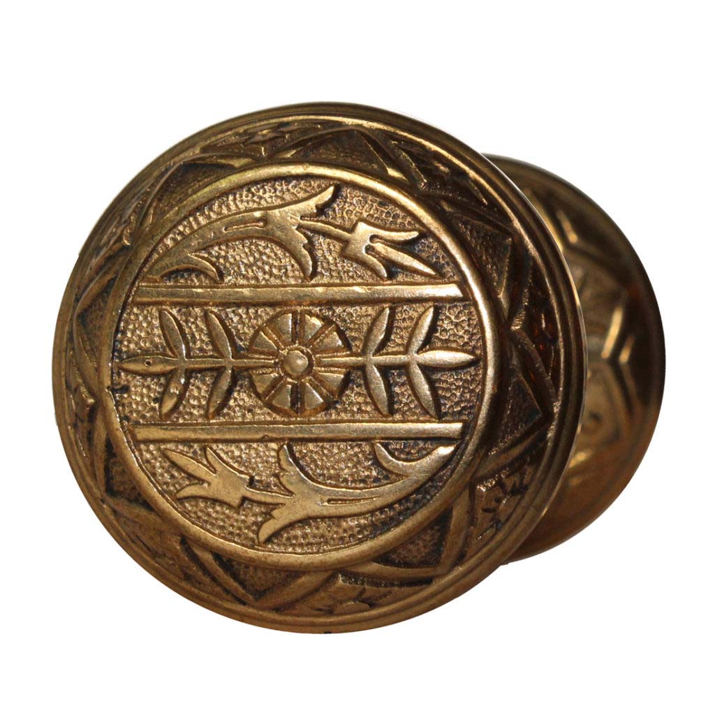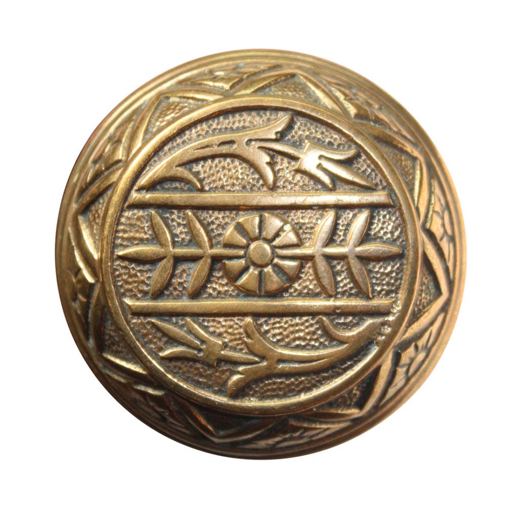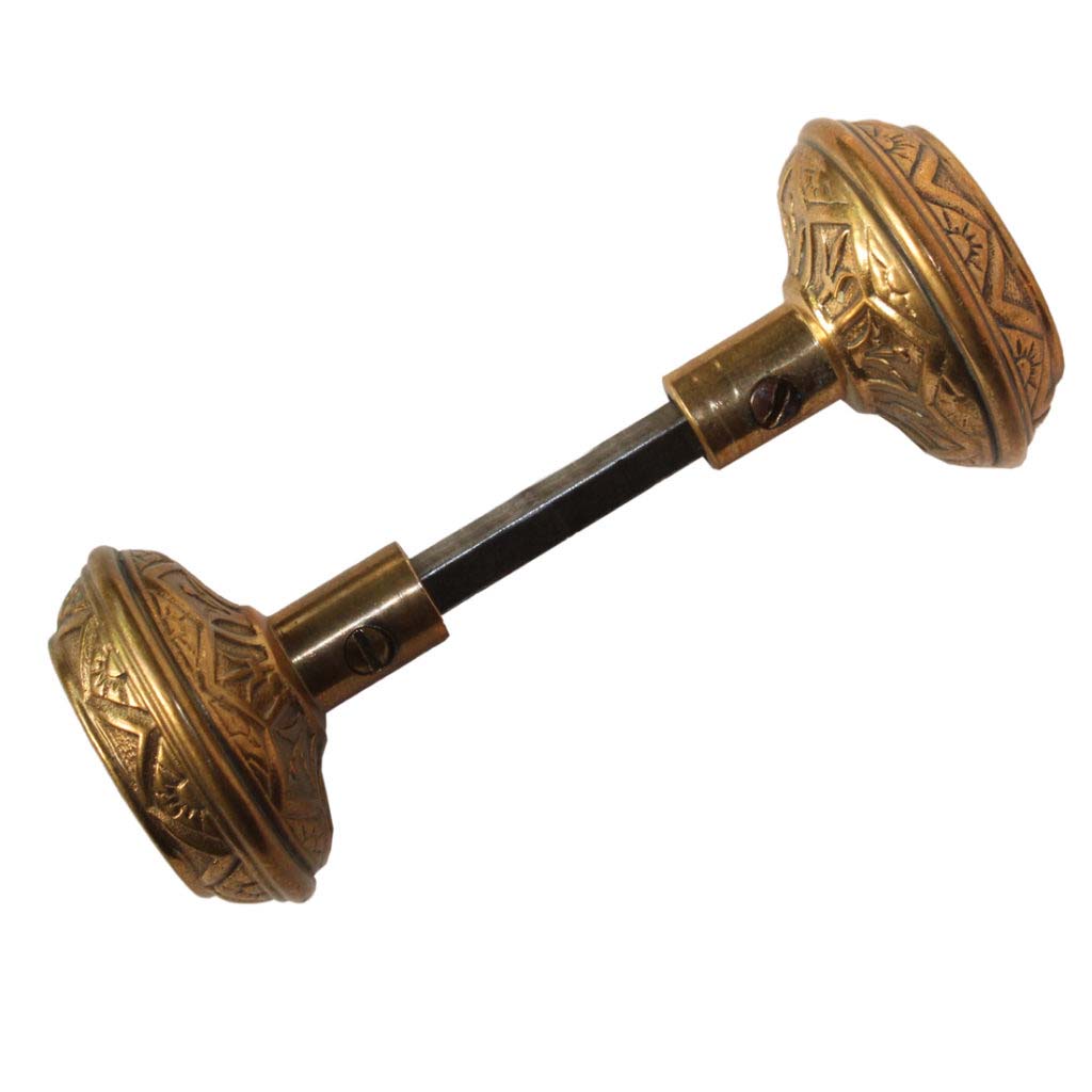 A delightful antique brass doorknob set, dating from the late 1800’s. Each domed door knob features a playful two-fold floral motif. This Eastlake doorknob set has a beautiful patina and is in very good condition; the set includes the connecting spindles and set screws. Each doorknob measures 2-1/4” in diameter and 1-7/8” deep.