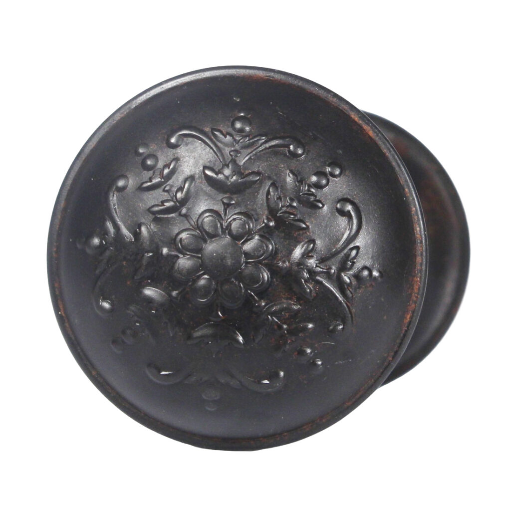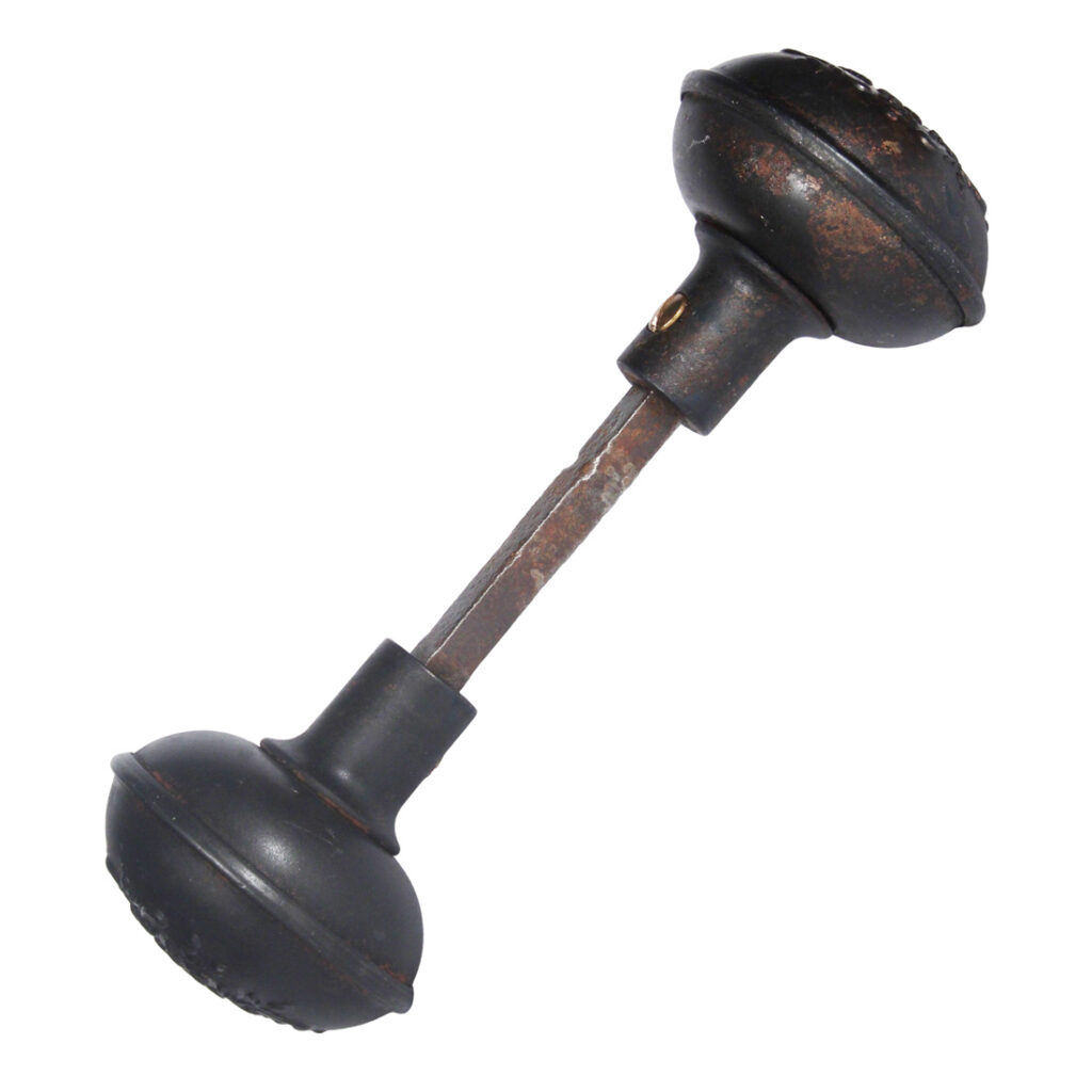 A charming antique doorknob set in Norwalk’s “Argyle” also known as “Rex”, dating c. 1905. Each door knob features a playful four-fold floral design. The set has a beautiful darkened patina and is in very good antique condition; this doorknob set includes two knobs, the connecting spindle, and two set screws. Each doorknob measures 2-1/4” in diameter and 2-1/8” deep.