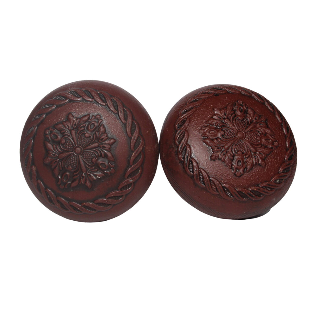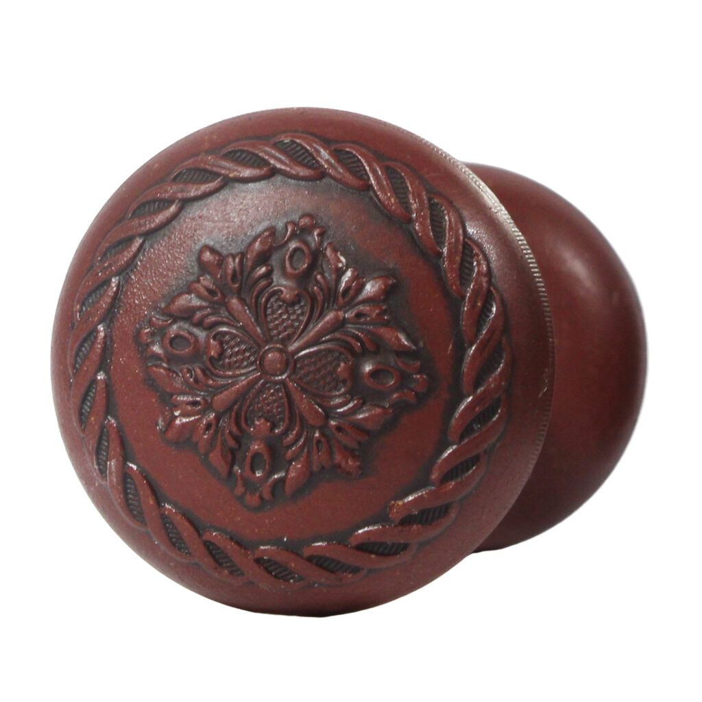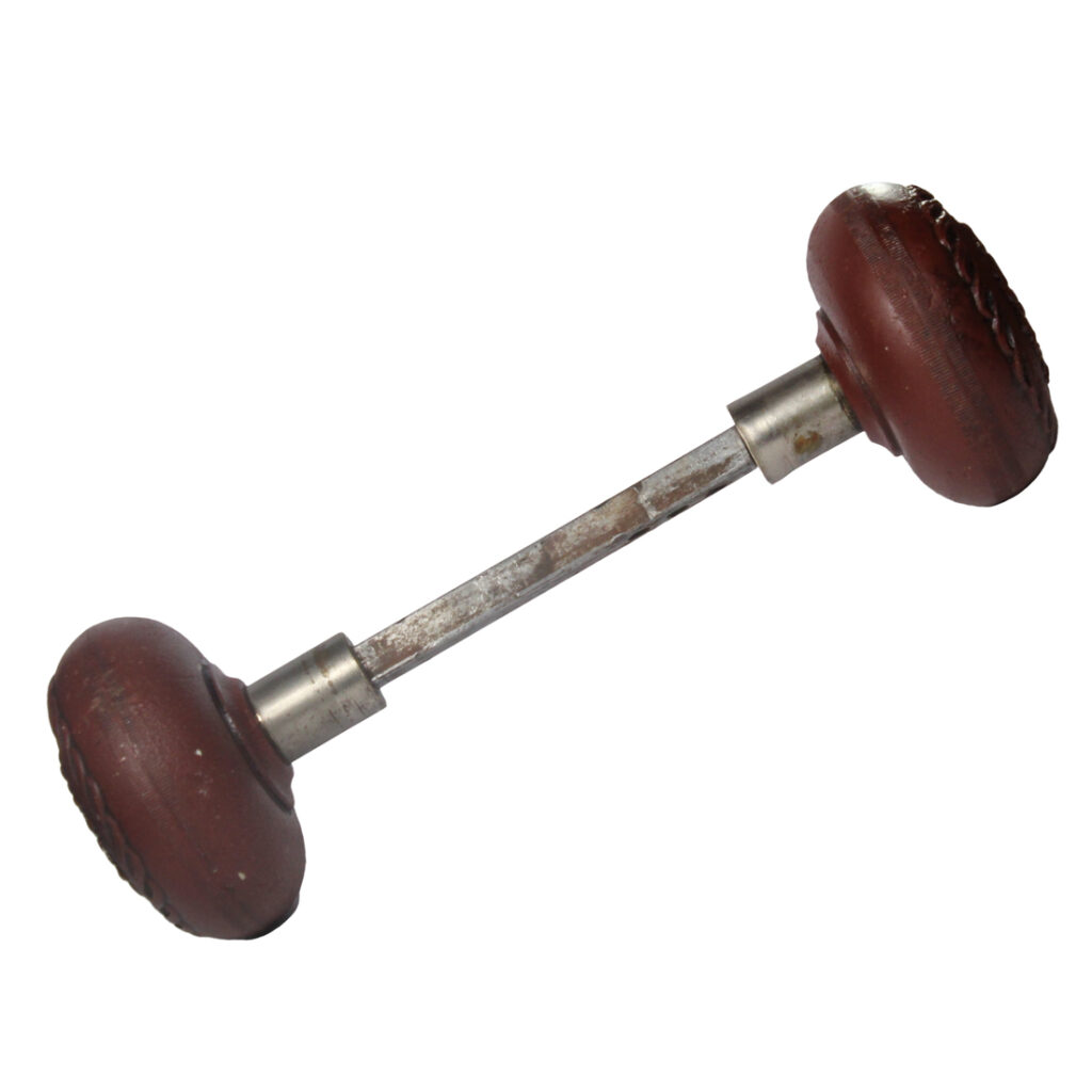 A stunning antique decorative doorknob set, dating from the late 1800’s. The set features a beautiful aged patina (pictured) and is in very good antique condition; this doorknob set includes two door knobs, the connecting spindle, and two set screws (enough hardware for one door). Each doorknob measures 2-3/8” in diameter by 2” deep.
