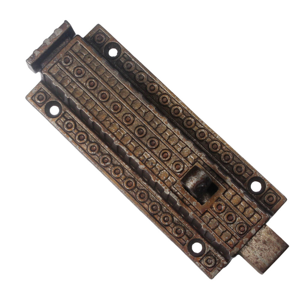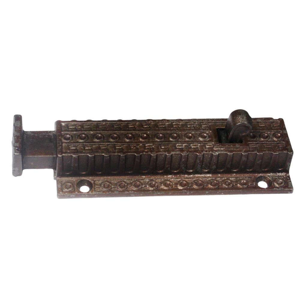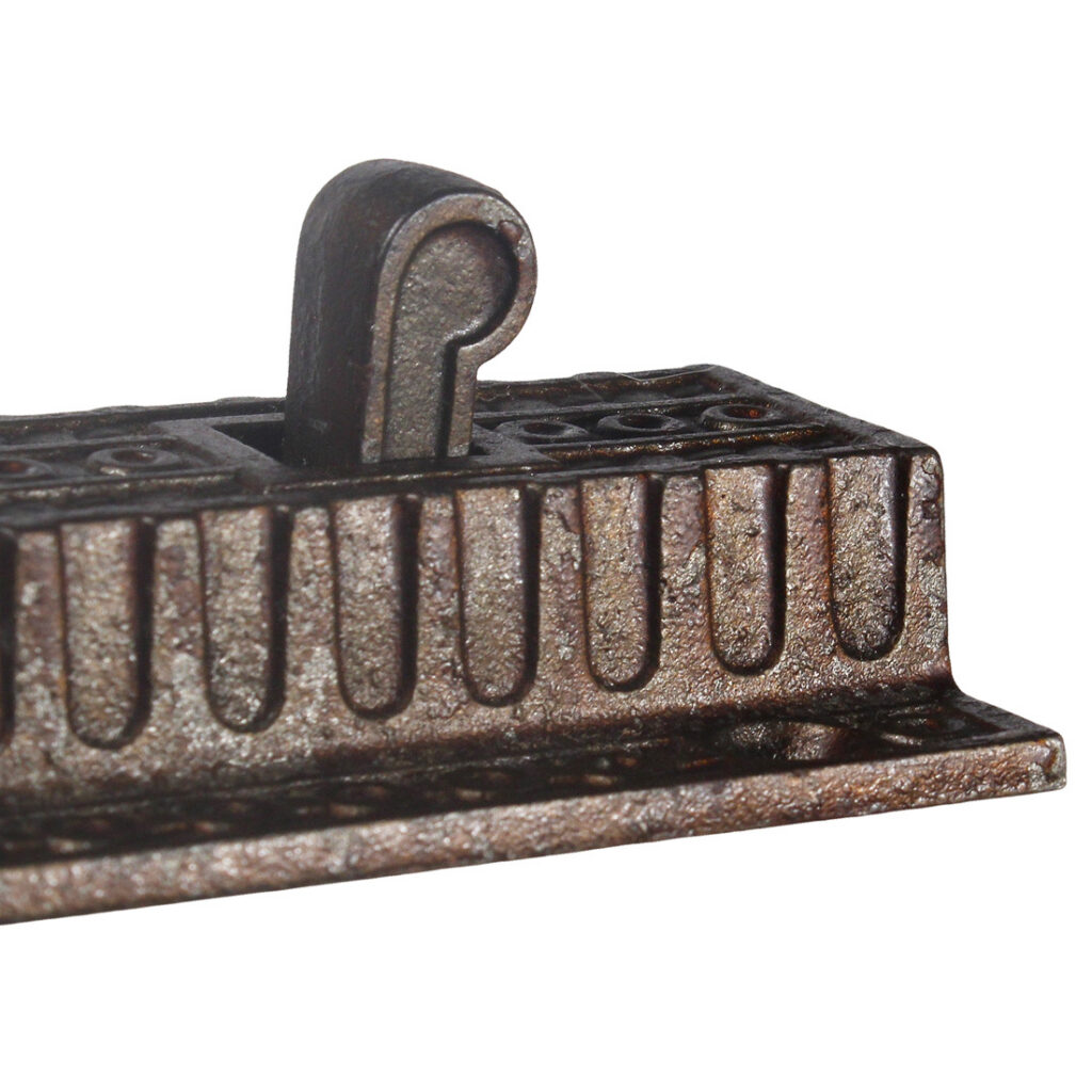 An incredible “New Old Stock” antique Eastlake cast iron surface mount foot bolt by Norwalk, dating from the late 1800’s. This bolt features a playful decorative Eastlake design, and is in excellent antique condition. The latch body measures 5-1/4” long, 2-1/4″ wide, and has a 3/4″ projection; the step bolt piece is 1″, and the bolt tongue is 5/8″. If ordering multiple items, please contact us for a combined shipping quote.