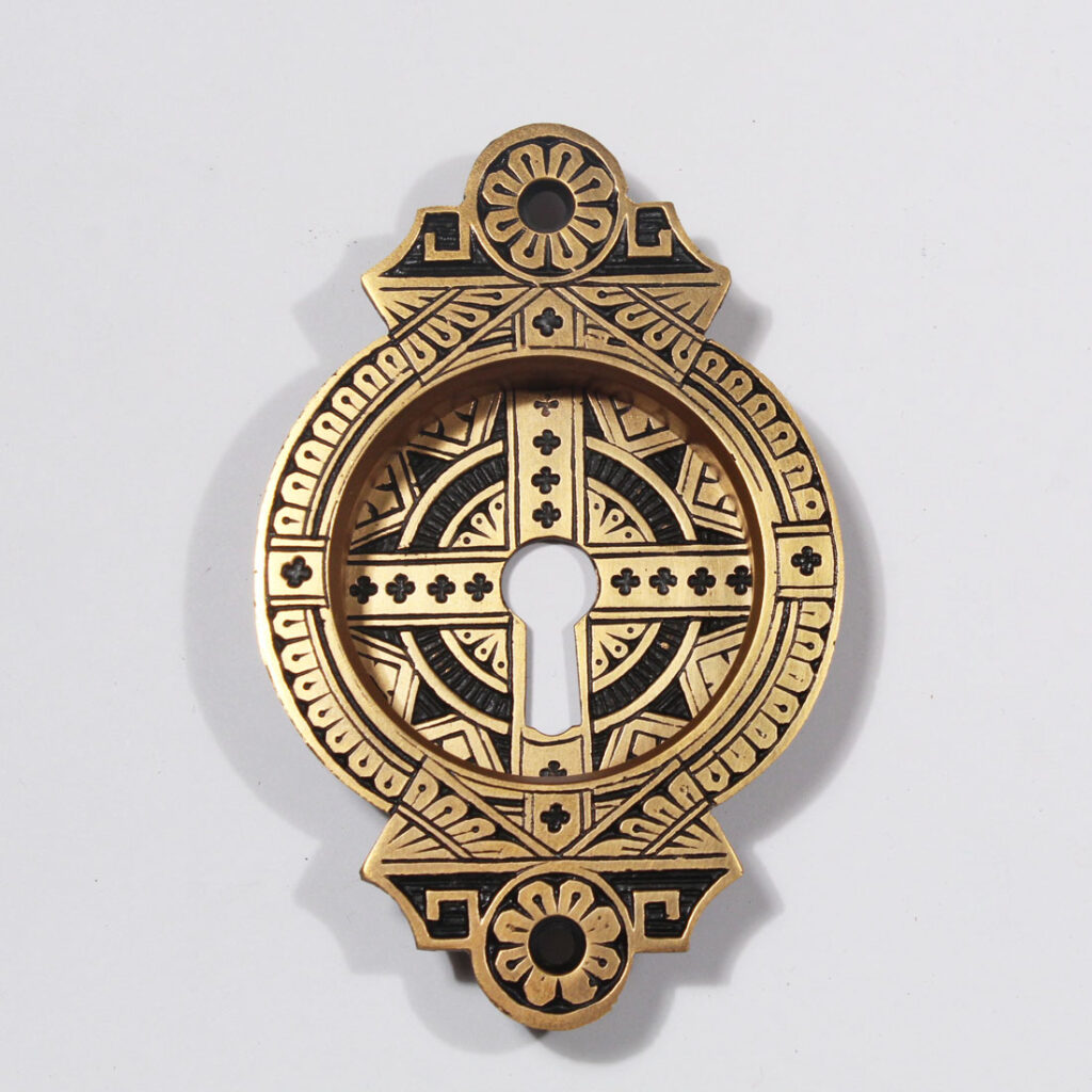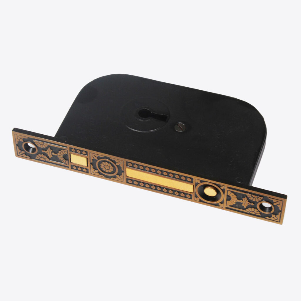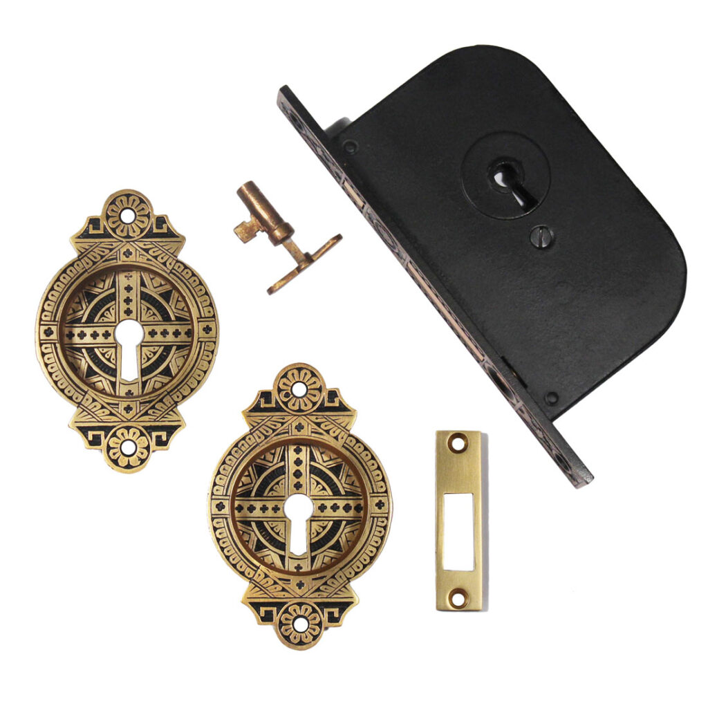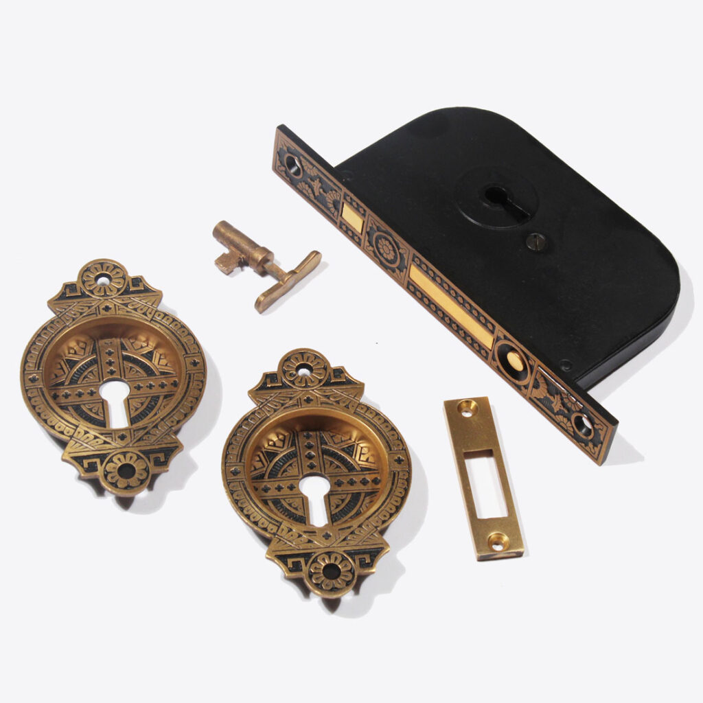 A stunning antique bronze Eastlake pocket door hardware set, dating from the late 1800’s and designed for a single door. This “New Old Stock” set includes two decorative pocket door plates, pocket door lock, strike, and key. The bronze doorplates are in excellent condition with a fabulous Eastlake design, and the lock is in very good antique condition. The plates measure 2-7/8″ wide and 4-3/8″ tall; the faceplate is 1″ wide and 7-5/8″ tall, and the box portion of the lock is 3-3/8” wide by 5-1/2” tall with a 2-1/16″ back set.