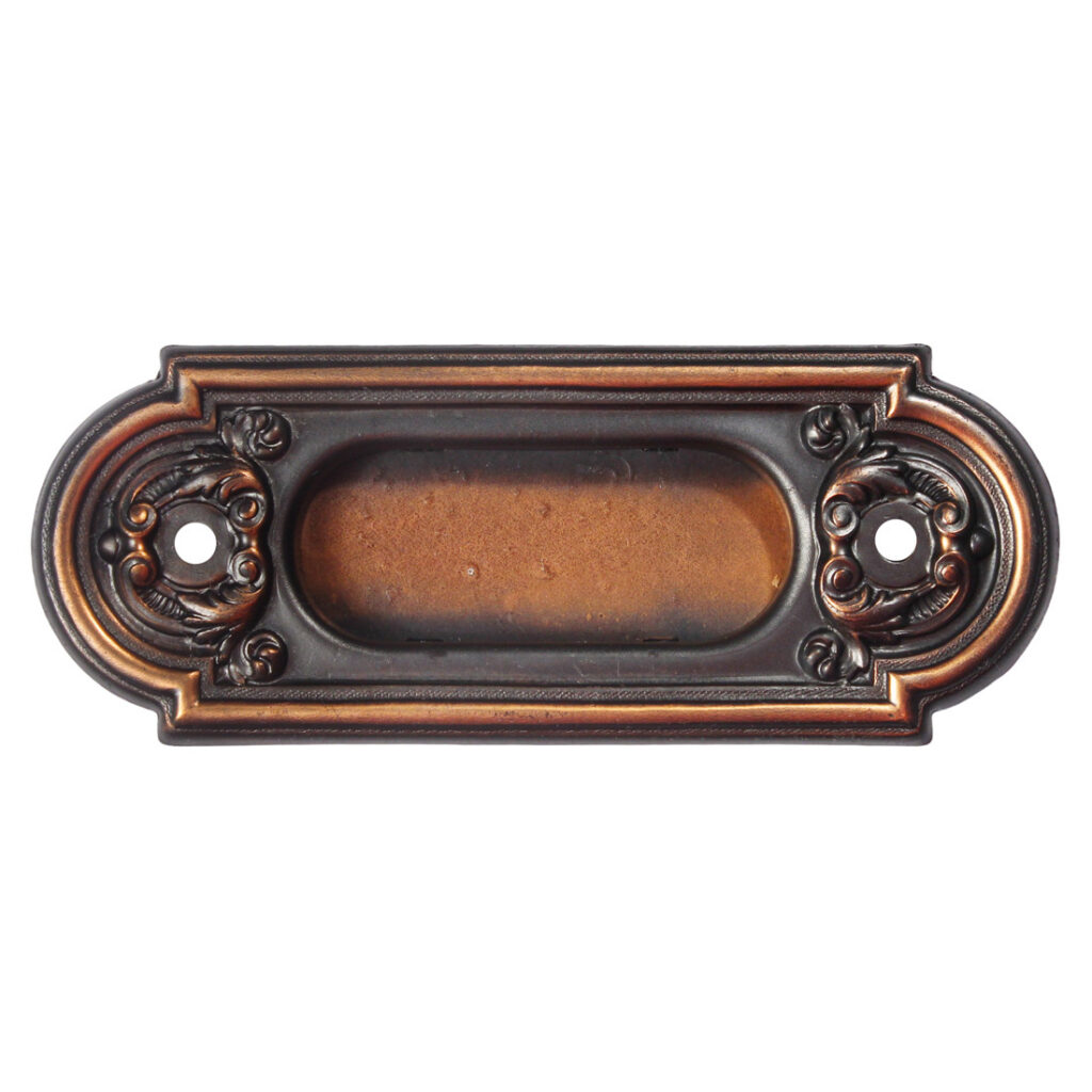 A beautiful pair of antique copper flashed sash lifts or petite pocket plates by Yale. These “New Old Stock” plates are in excellent antique condition with a beautiful copper flash or “japanned” finish over steel. Each plate measures 4-5/8” wide by 1-1/2” tall. THE PRICE LISTED IS FOR EACH SASH LIFT. If ordering multiple items, please contact us for a combined shipping quote.