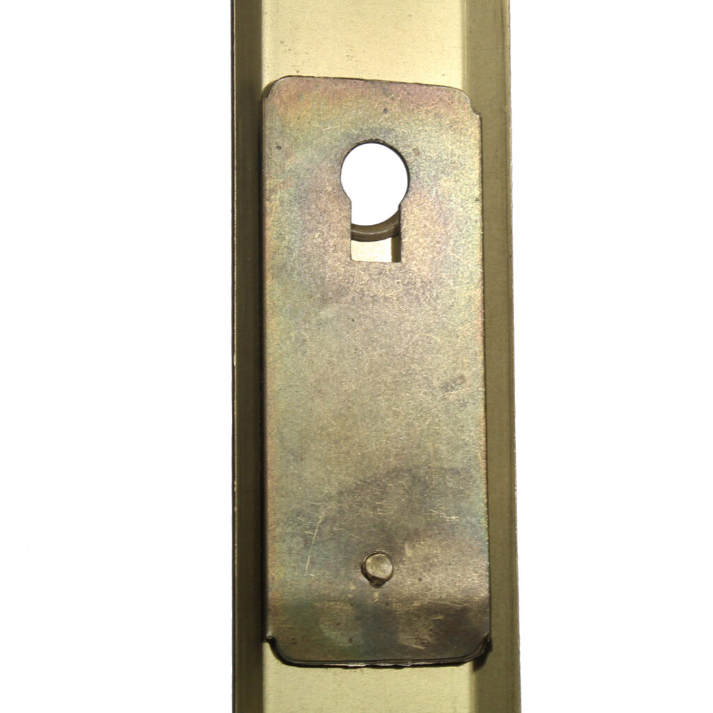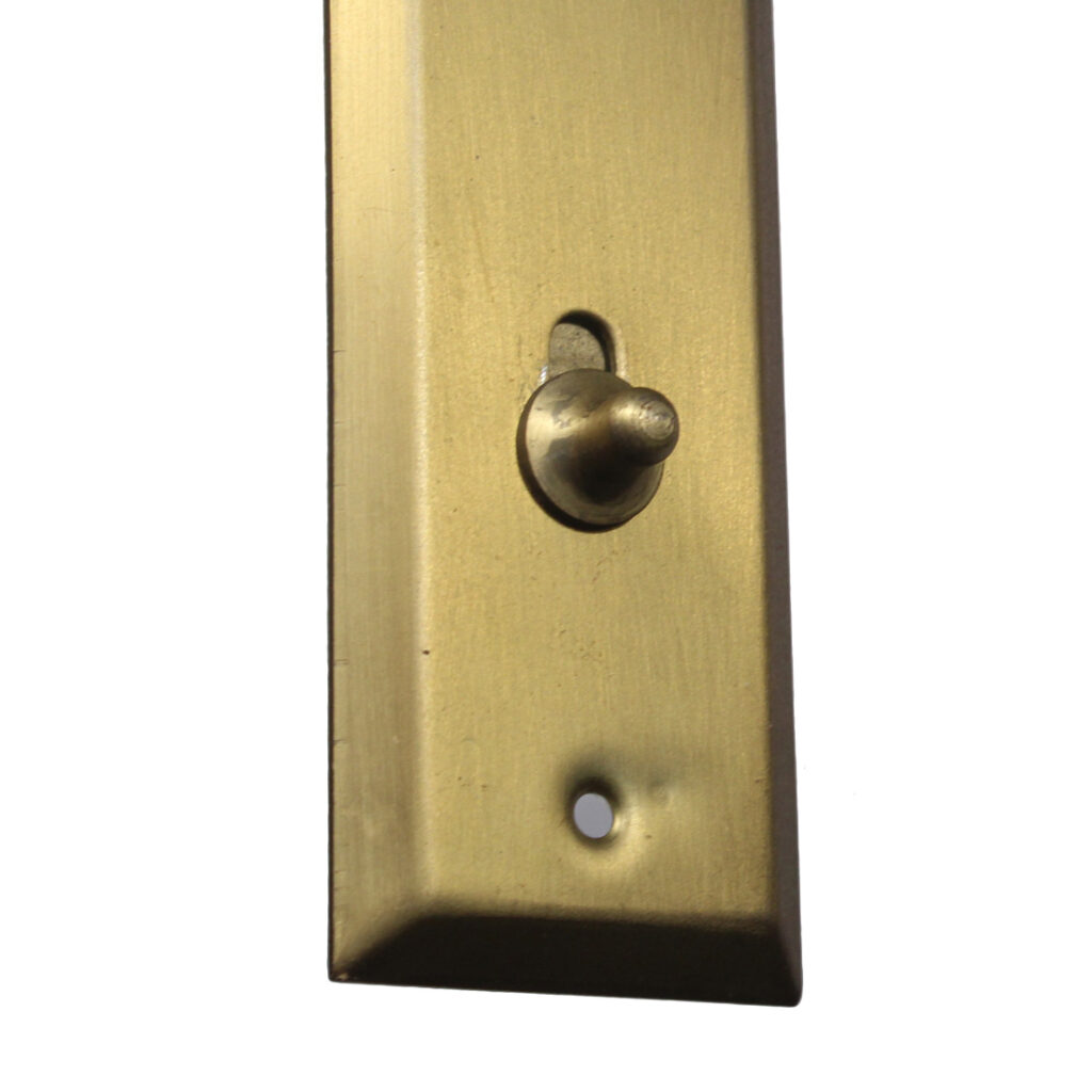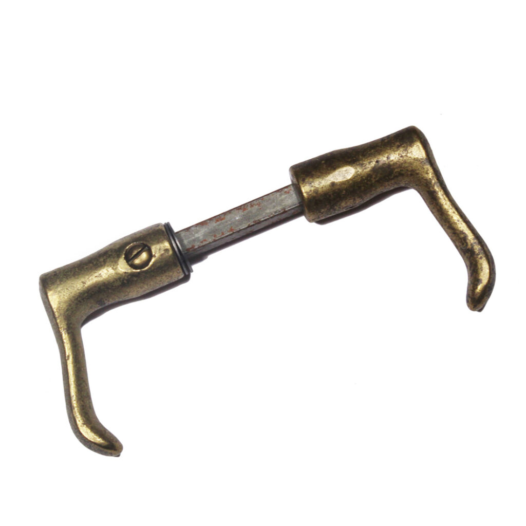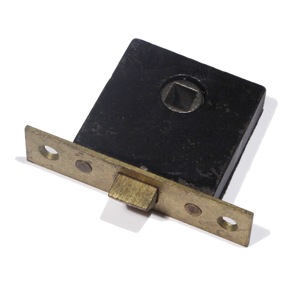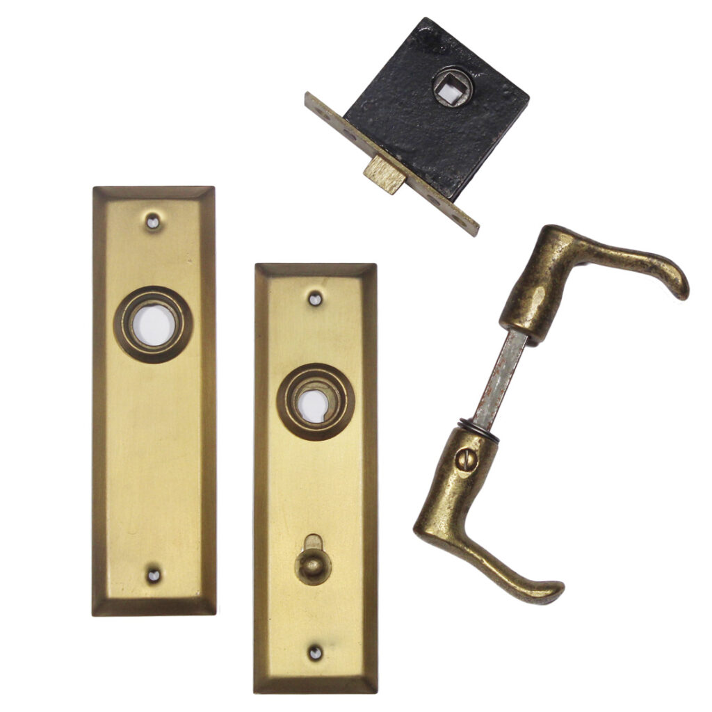 An amazing antique screen door hardware set, dating from the early 1900’s. This screen door hardware set is “New Old Stock”, so it is in marvelous antique condition; the door knob lever each measure 2-1/4″ wide by 1-5/8″ deep; the plates are 1-1/16″ wide by 5-7/8″ tall. The lock face measures 3/4″ wide by 3″ tall; the lock body measures 1-7/8″ wide, 1-7/8″ tall, and is 1/2″ thick; the back set is 1-3/8″. This set includes a pair of doorknobs with the connecting rod and set screws,a pair of doorplates, and the mortise latch (enough hardware for one door). If ordering multiple items, please contact us for an accurate shipping quote.