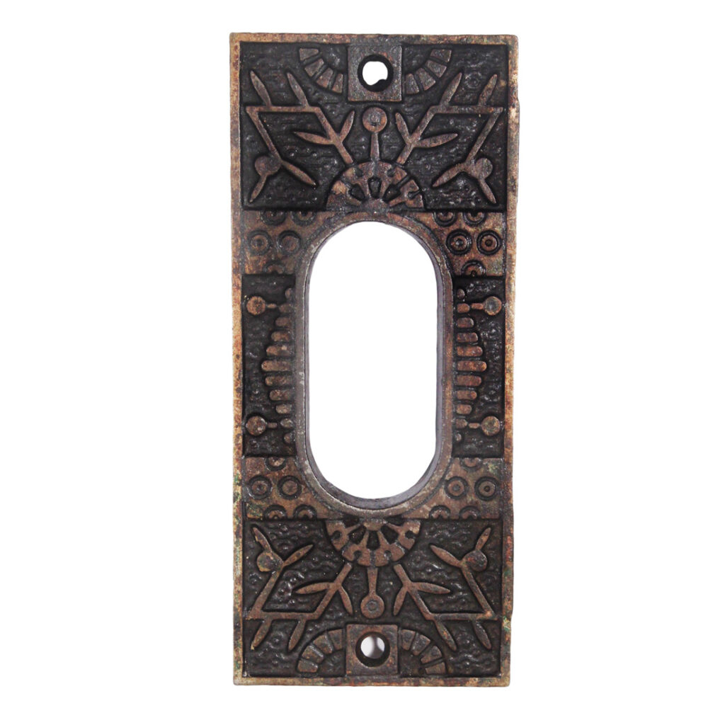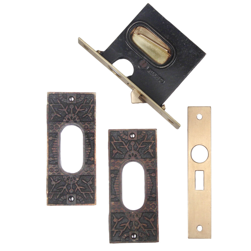 Incredible antique cast iron finger lever pocket door hardware set in Reading’s “Windsor” pattern, dating c. 1884 and designed for a single door. The door plates are in excellent condition and the lock is in very good antique condition. The plates measure 2-1/8″ wide, 4-7/8″ tall; the lock has a 2″ backset, and its faceplate is 1″ wide and 5-3/4″ tall; the lock body measures 3-1/8” wide by 3-3/8” tall.
