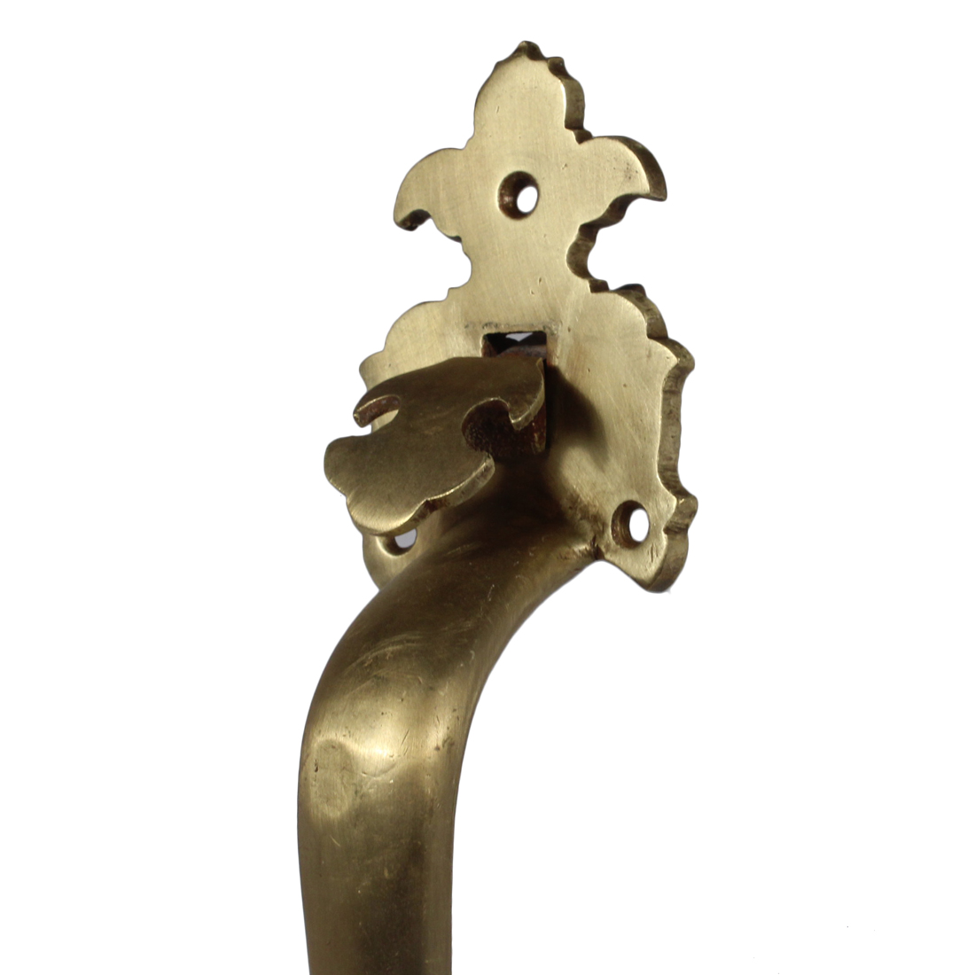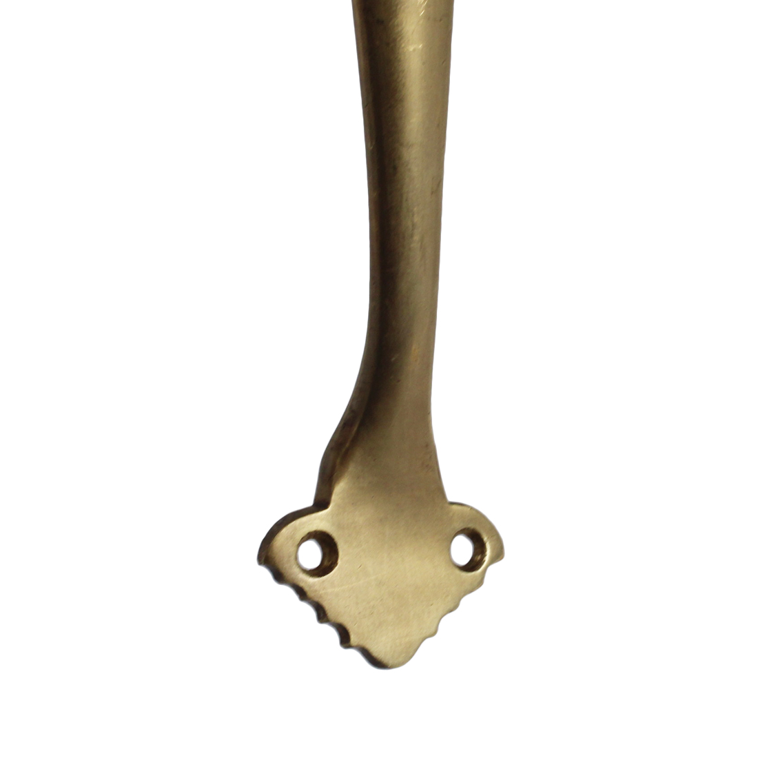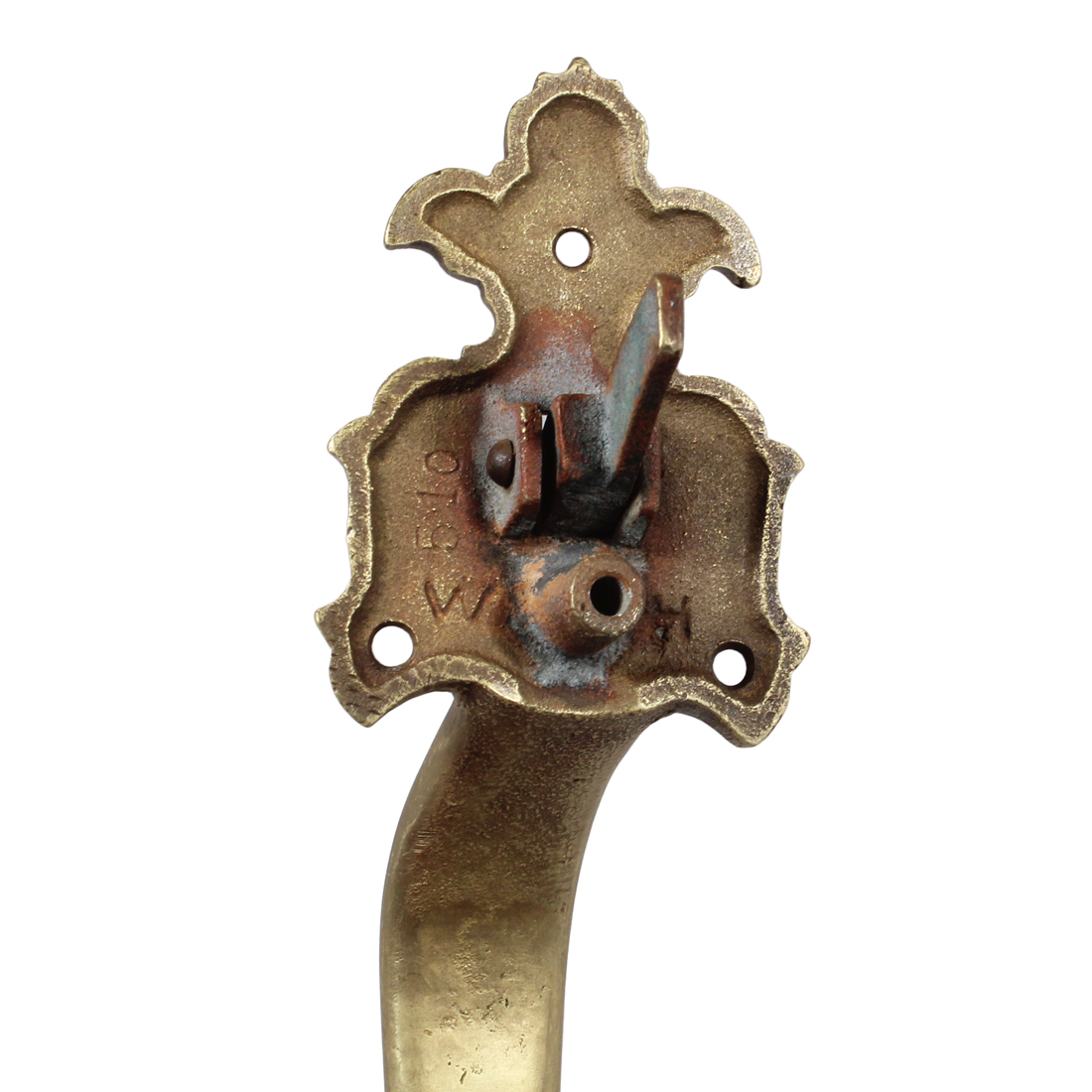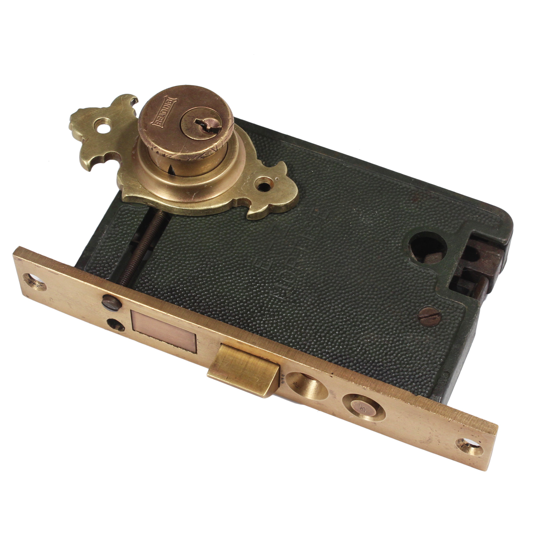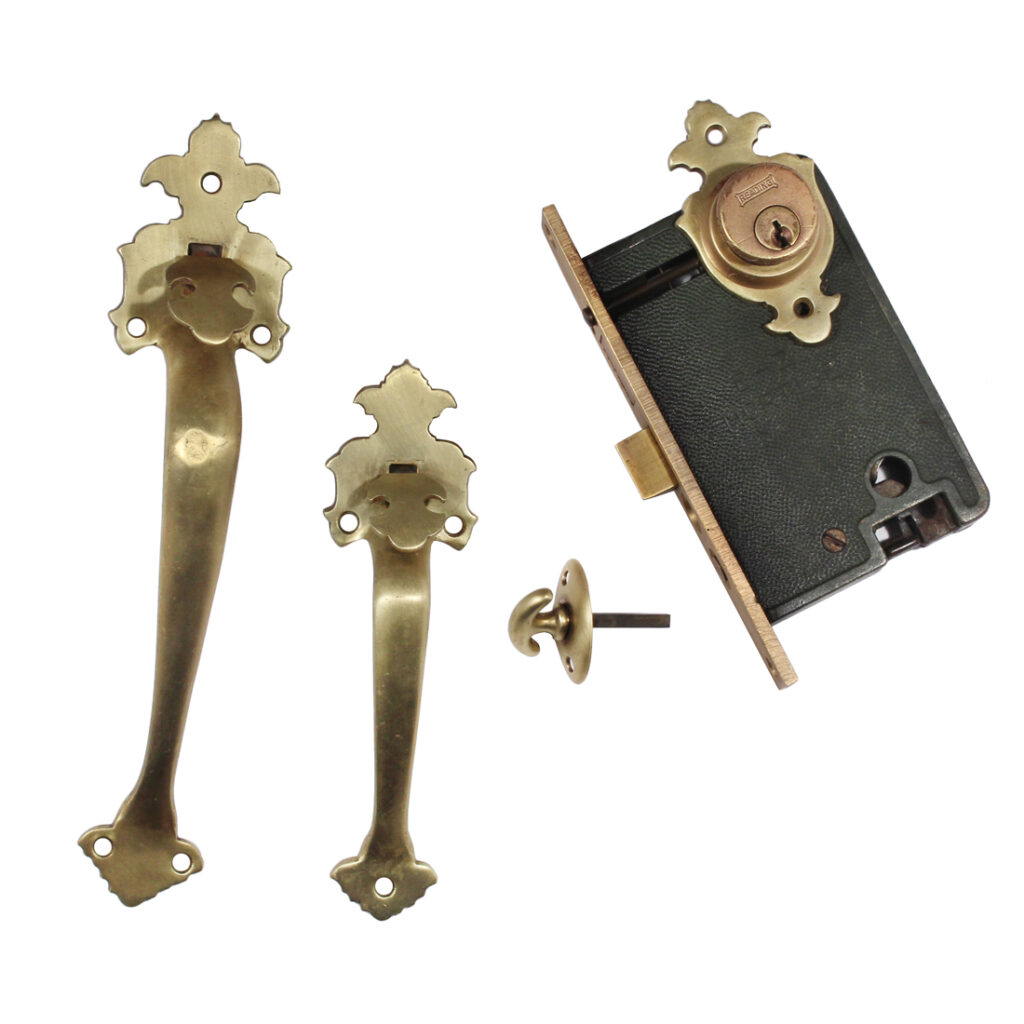 A wonderful complete working thumb-latch set for an exterior door, dating from the 1930’s. This door hardware set consists of a large exterior handle with a thumb latch, a smaller coordinating interior handle, thumb turn, lock cylinder escutcheon, and mortise lock. The cast brass handles feature a distinctive design at the top and bottom, with a matching decorative escutcheon for the lock cylinder. This hardware set is in very good antique condition. The larger handle measures 10-5/8” tall, 2-1/2” wide with a 2″ projection, and the smaller handle is 7-5/8″ tall by 2″ wide with a 1-1/2″ projection. The mortise faceplate measures 7-1/8″ tall by 1-1/8″ wide and the body is 5-1/2″ tall by 3-3/8″ wide with a 2-5/8″ backset.