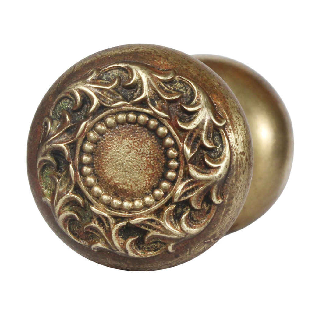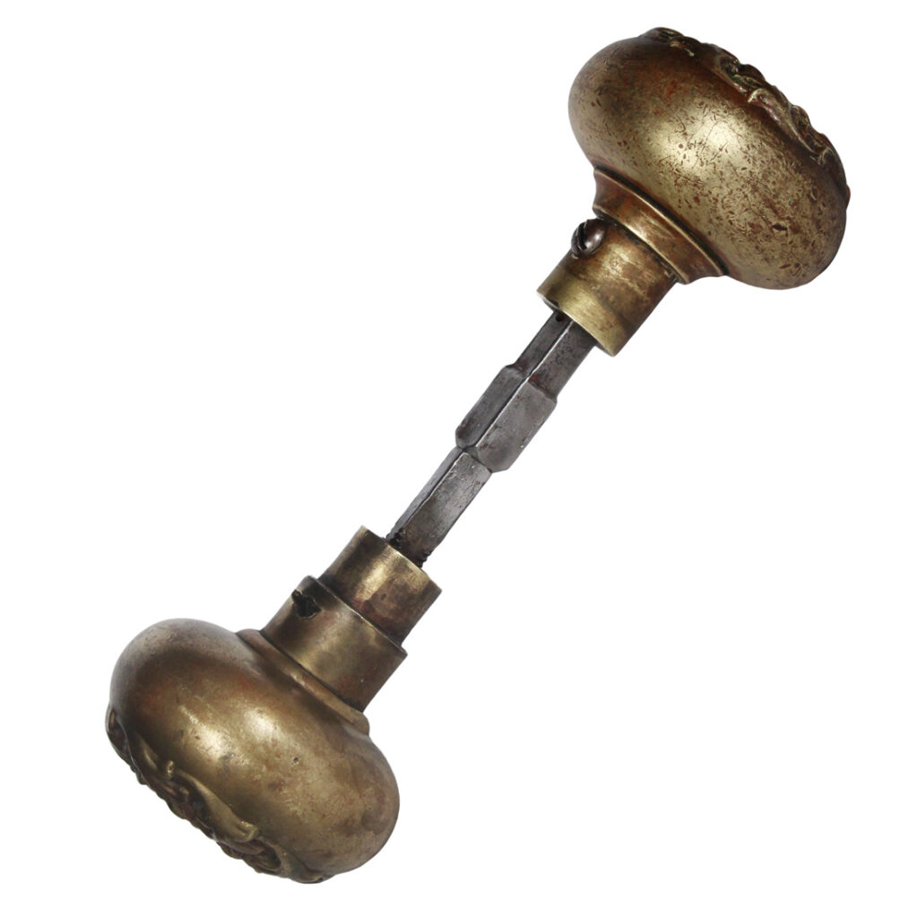 A gorgeous set of antique doorknobs in Russell & Erwin’s “Avallon” pattern, dating c. 1909. Each decorative knob set is in excellent antique condition, and features a gorgeous aged bronze patina (as pictured); the set includes two knobs, a connecting rod, and two set screws (enough hardware for one door). Each doorknob measures 2-1/4” in diameter and 2-1/4” deep.