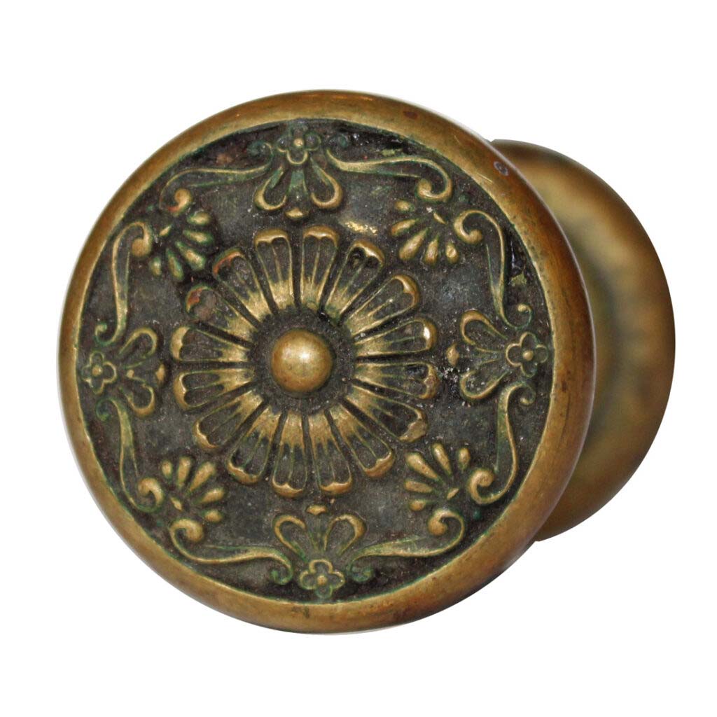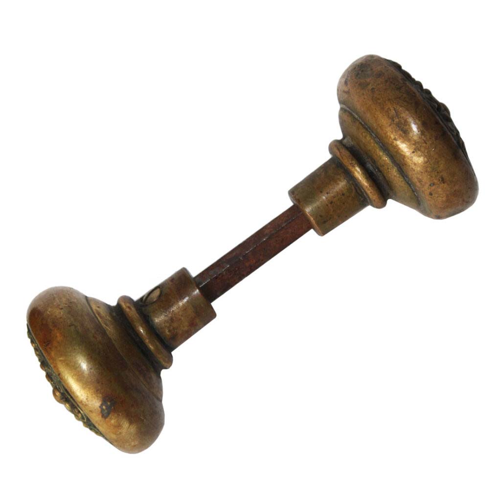 An unusual set of antique cast bronze doorknobs in Corbin’s “Parthenon” pattern, circa 1900, with a spindle and set screws. The knob features a fourfold design inspired by the stonework on the Parthenon, with a gorgeous natural patina and slight wear along the edges (as pictured). Each doorknob measures 2-3/8” in diameter and 2-1/8” deep. If ordering multiple items, please contact us for an accurate shipping quote.