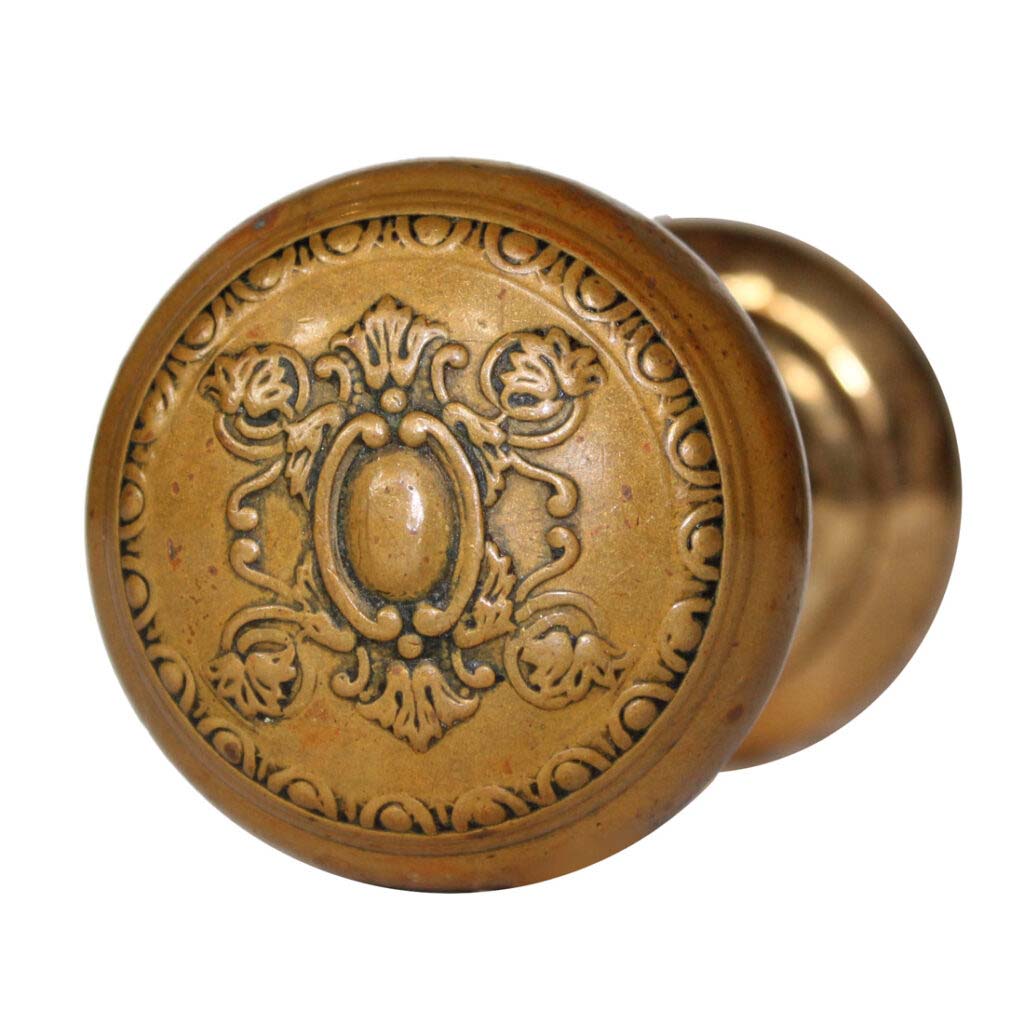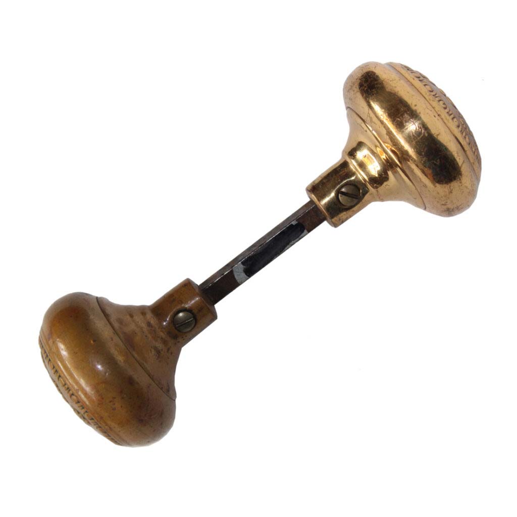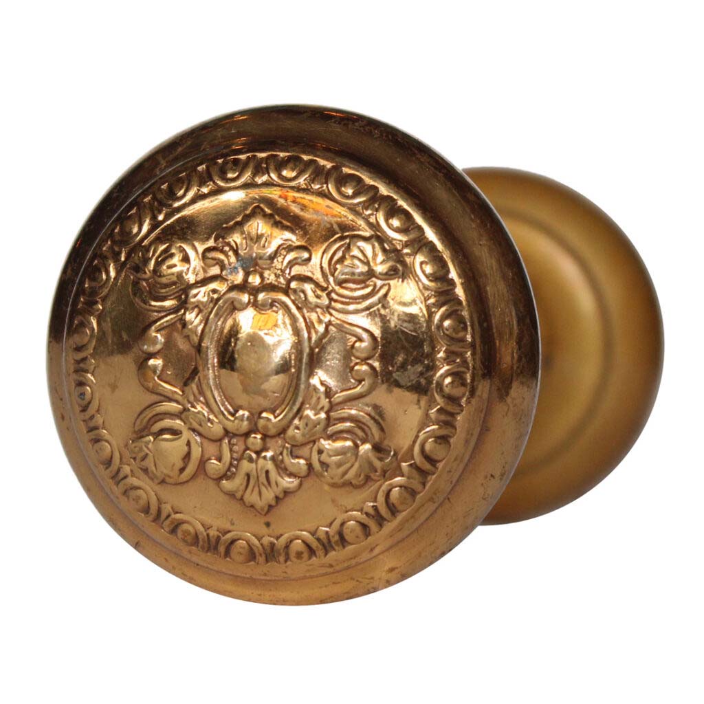 A fabulous antique brass doorknob set in Reading Hardware’s “Creston” design, dating circa 1900. Each doorknob features a radial design of stylized leaves and volutes, surrounded by an egg & dart border. The set has one knob with a bright brass finish, and another with a more aged patina; this doorknob set includes two knobs, the connecting spindle, and two set screws. They each measure 2-1/2” in diameter and 2-1/4” deep.
