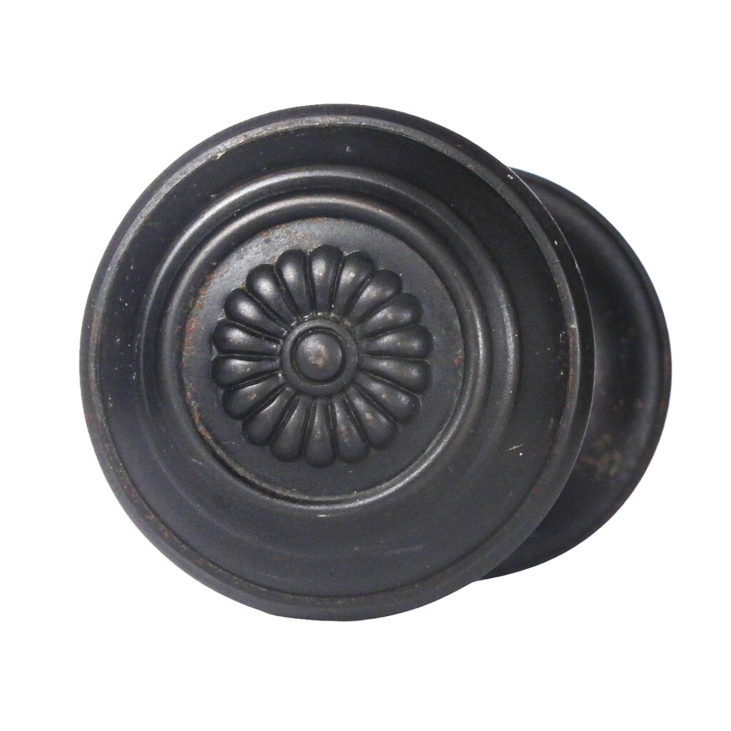 Lovely sets of antique steel doorknobs featuring a daisy at its center, dating from the early 1900s. Each knob set is in excellent antique condition, and features a gorgeous darkened patina (as pictured); THE PRICE LISTED IS FOR EACH DOOR KNOB SET – a set includes two knobs, a connecting rod, and two set screws (enough hardware for one door). Each doorknob measures 2-1/4” in diameter and 2” deep.