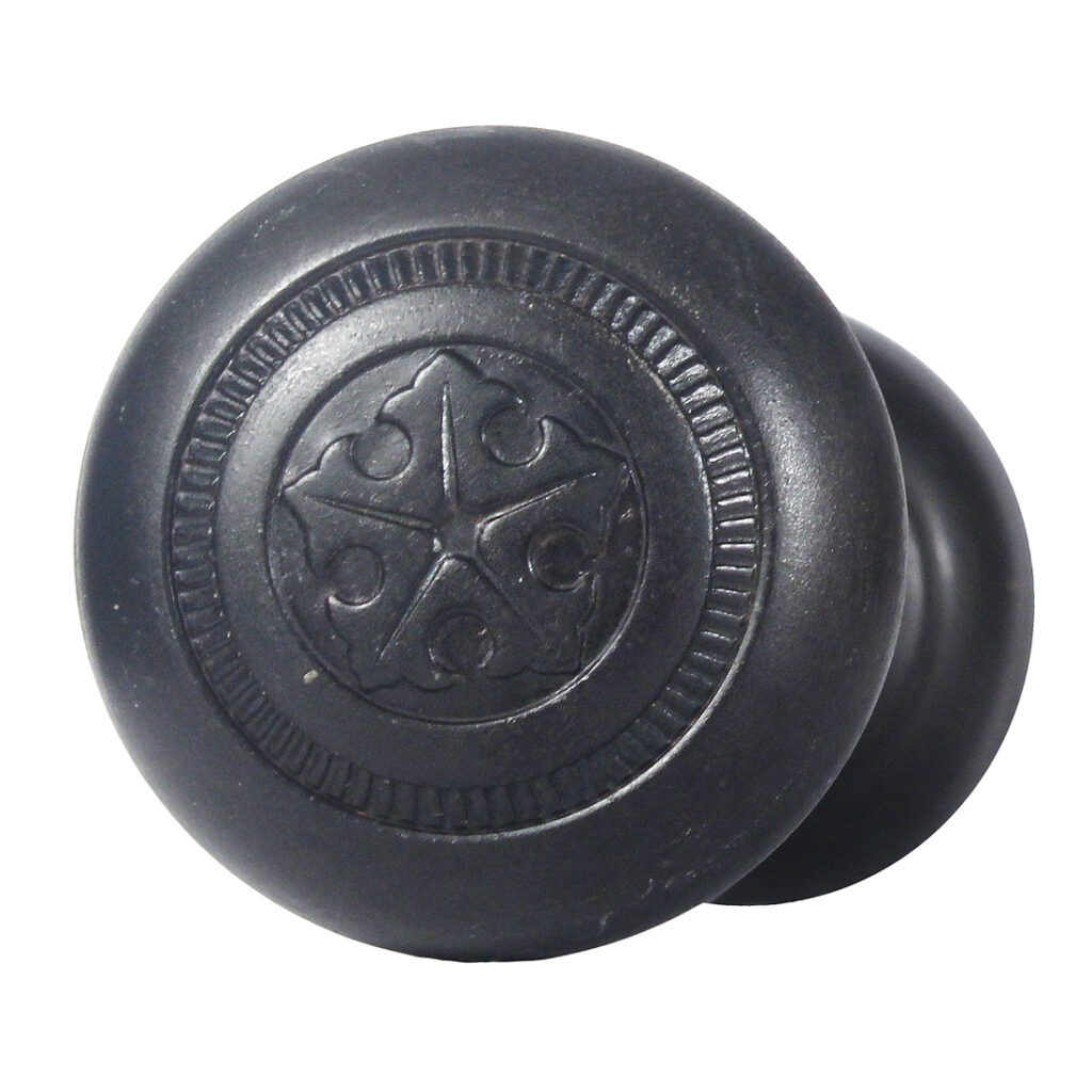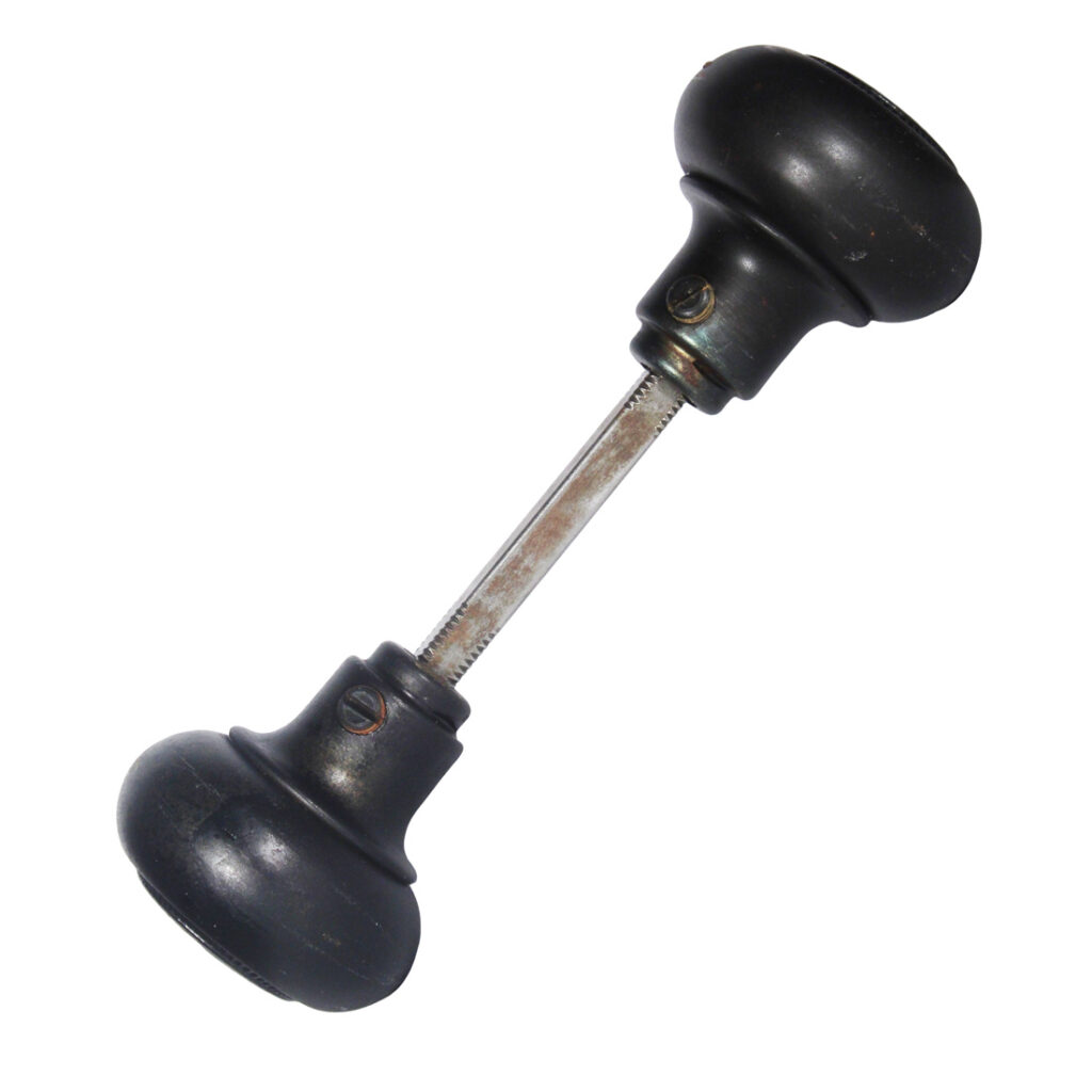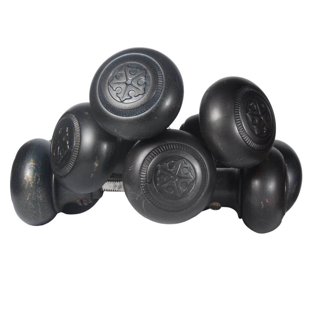 Nice sets of antique doorknobs in Sager’s “Empire” pattern, dating c. 1937. Each knob set is in excellent antique condition, and features a gorgeous darkened patina (as pictured); THE PRICE LISTED IS FOR EACH DOOR KNOB SET – a set includes two knobs, a connecting rod, and two set screws (enough hardware for one door). Each doorknob measures 2” in diameter and 2” deep.