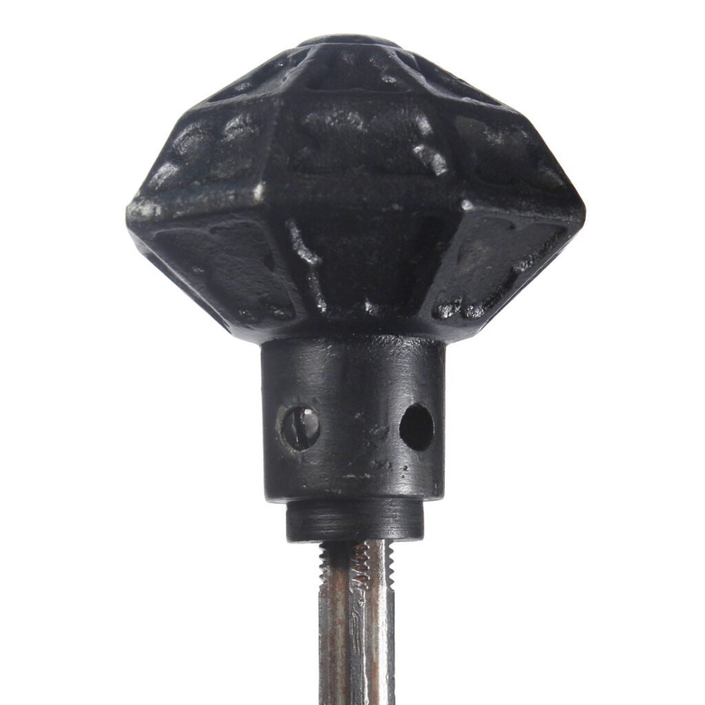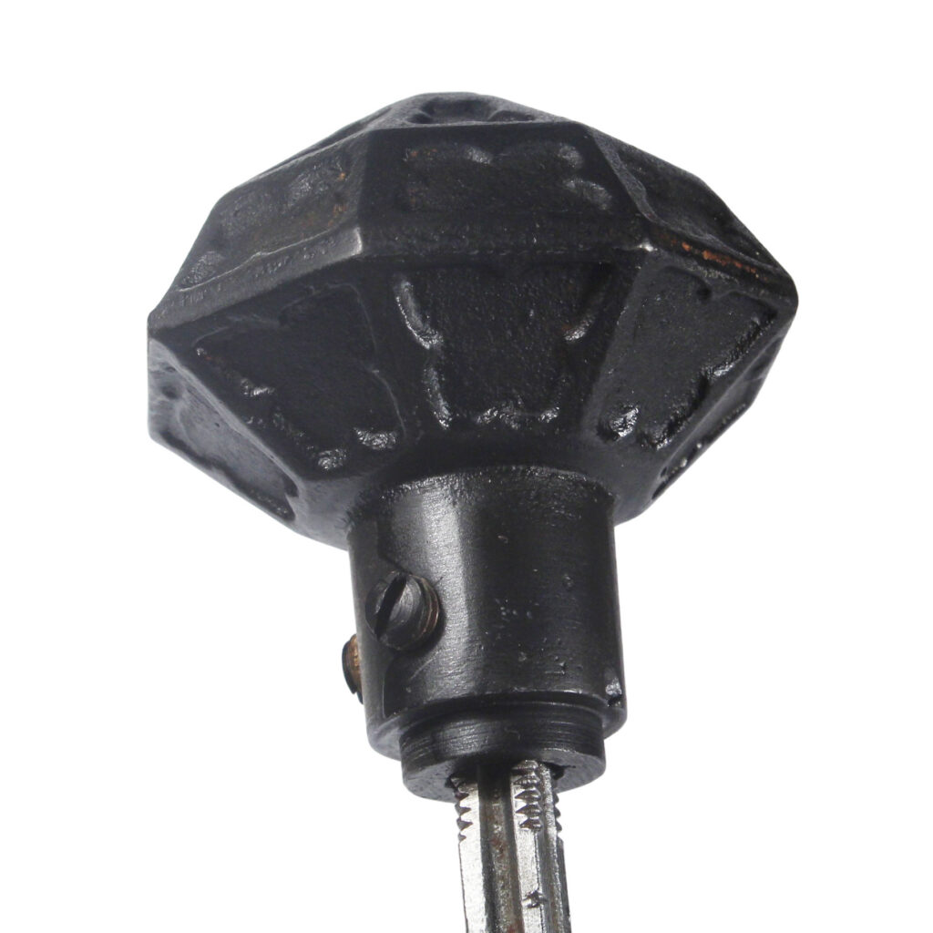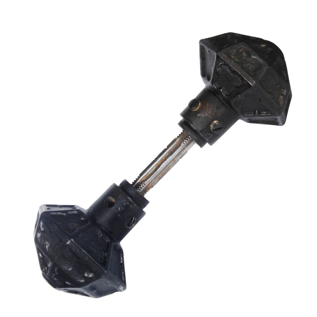 Incredible antique cast iron octagonal doorknob set, dating from the early 1900’s. Each octagonal doorknob features a fabulous textured design with stylized quatrefoils, and is in excellent antique condition; the set includes two knobs, the connecting spindle, and set screws. Each knob measures 2-1/4″ in diameter by 2-1/2″ deep.
