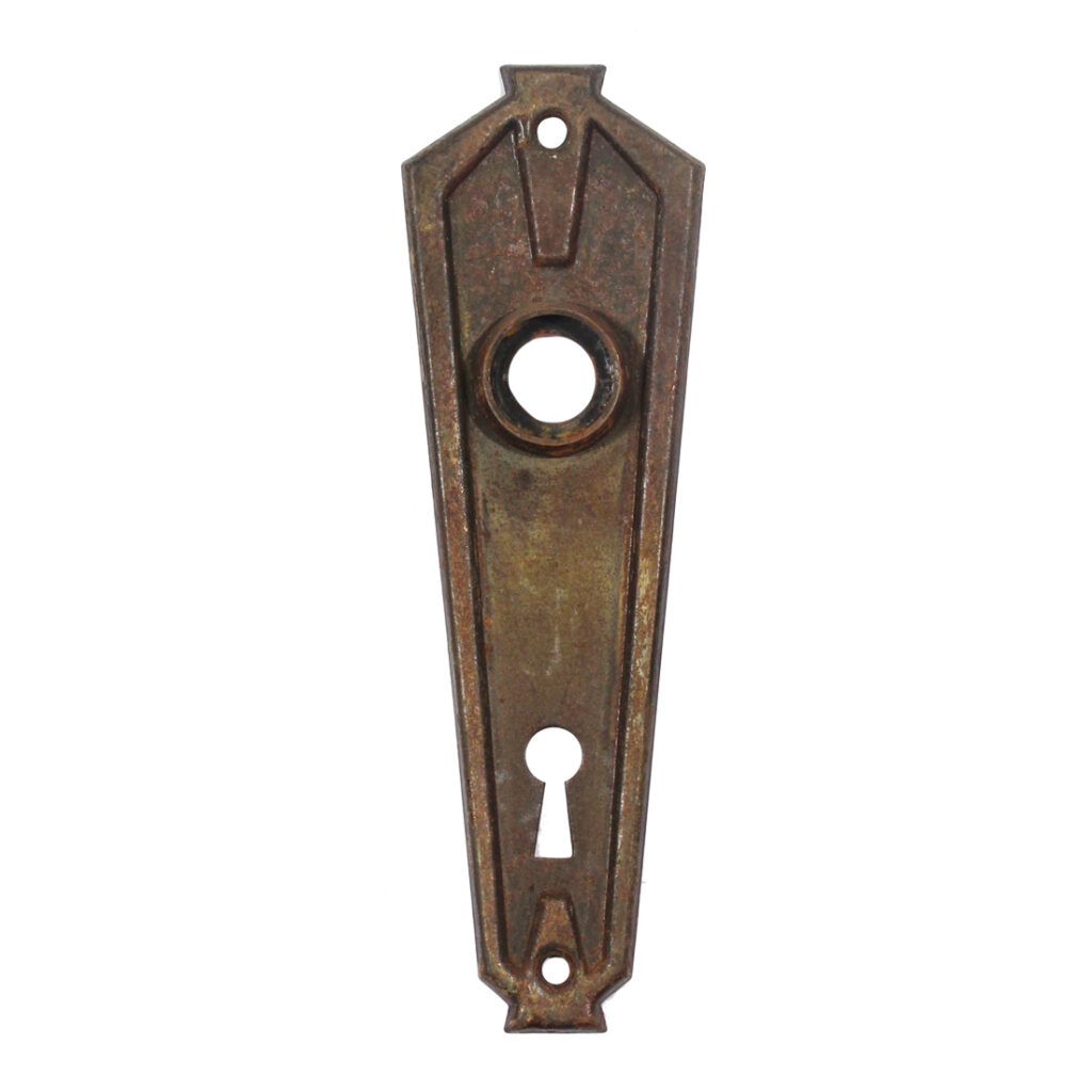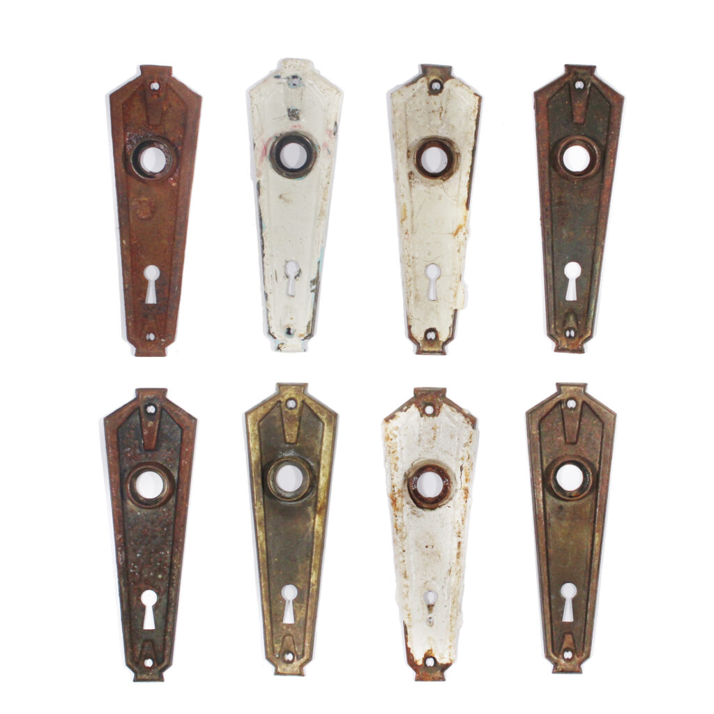 Antique door plates with an angular art deco design, c. 1920’s. These backplates measure approximately 1-3/4″ wide by 5-5/8″ tall. The condition of the finish on this hardware varies, as shown. THE PRICE LISTED IS FOR EACH DOOR PLATE. If you are ordering multiple items, please contact us for an accurate shipping quote.