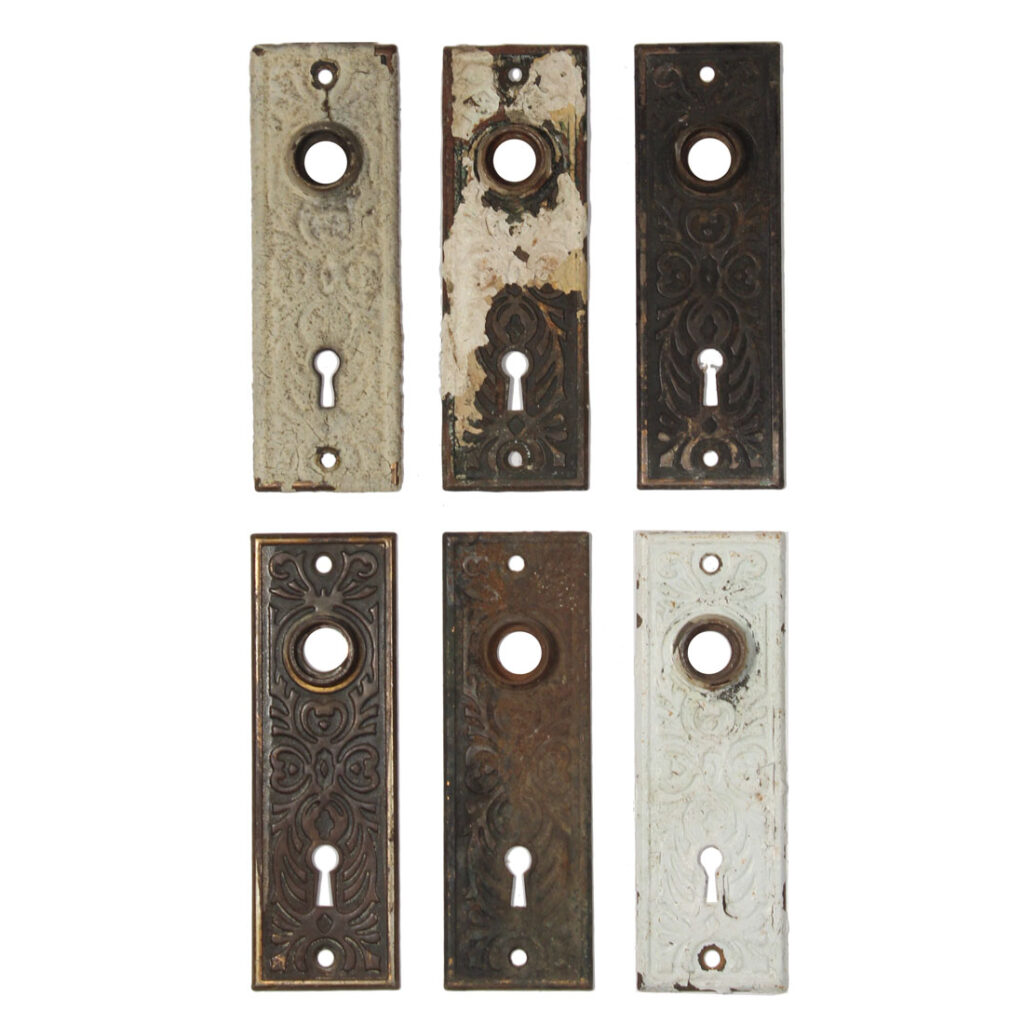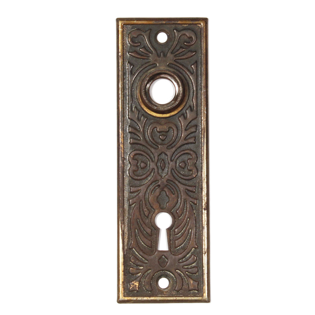 Lovely antique decorative door plates, dating from the early 1900’s. Each backplate features a fabulous design of stylized foliates and scrolling volutes. The plates are in very good antique condition; the condition of the finish on this hardware varies as shown. Each escutcheon measures 5-1/2” tall by 1-3/4” wide. THE PRICE LISTED IS FOR EACH PLATE. If you are ordering multiple items, please contact us for an accurate shipping quote.