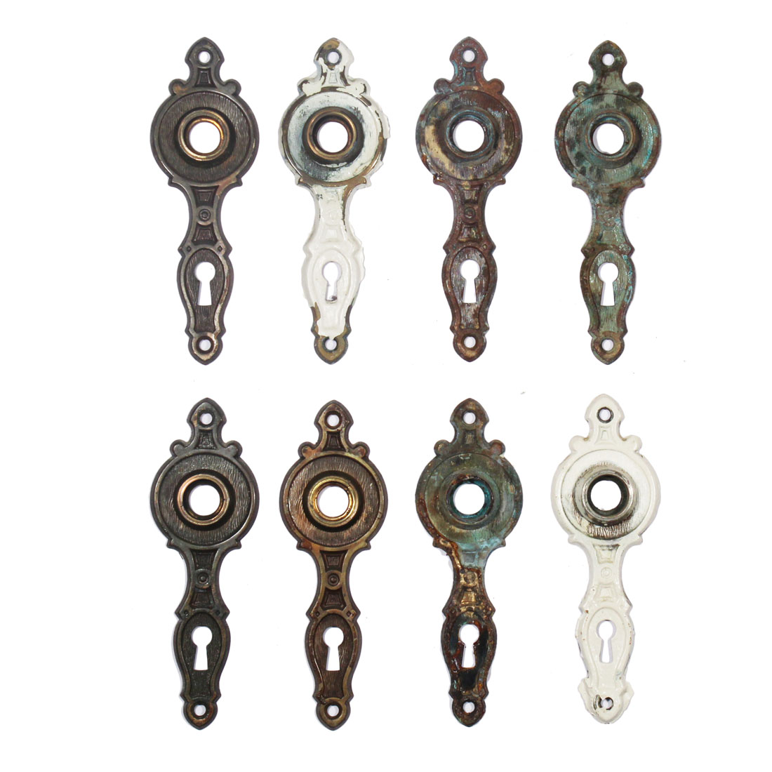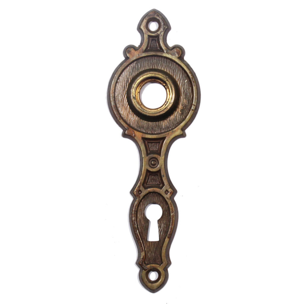 Fabulous antique doorplates in Yale & Towne’s “Derbian” pattern, dating c. 1929. The condition of the finish on each door plate may vary, as shown. Each escutcheon measures 1-7/8″ wide and 5-1/2″ tall. If you are ordering multiple items, please contact us for an accurate shipping quote. THE PRICE LISTED IS FOR EACH DOOR PLATE.