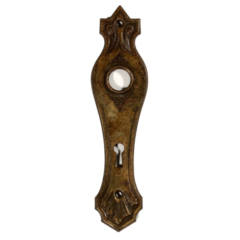 Unusual antique doorplates, dating from the 1920’s or 1930’s. These doorplates feature a tapered body, stylized fleur-de-lis, and scale and foliate details. Each doorplate is 1-13/16″ wide and 7-1/4″ long. Condition of the finish varies as shown. THE PRICE IS FOR EACH DOOR PLATE. At checkout, if ordering multiple items, please select FedEx Shipping instead of Product-Based Shipping to obtain an accurate shipping quote.