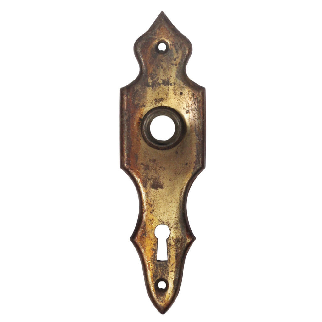 Fabulous matching antique doorplates, dating from the early 1900s, and featuring a curvy silhouette with a stylized spade at top. The plates are in very good antique condition; the condition of the finish on this hardware varies, as shown. Each escutcheon measures 1-7/8″ wide and 6-1/2″ tall. If you are ordering multiple items, please contact us for an accurate shipping quote. THE PRICE LISTED IS FOR EACH DOOR PLATE.
