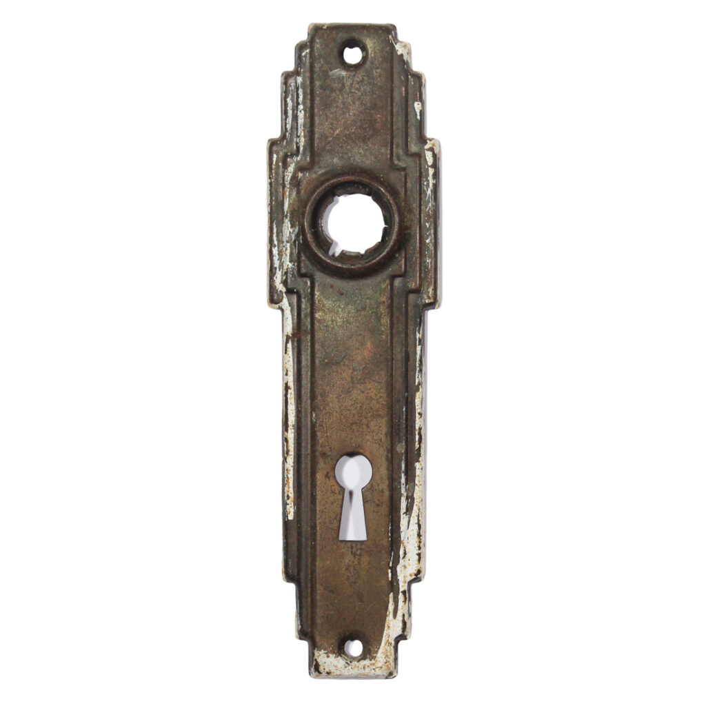 Fantastic antique Art Deco door plates with an angular “ziggurat” design, dating from the 1930’s. These backplates measure approximately 1-5/8″ wide by 5-3/4″ tall. The condition of the finish on this hardware varies as shown. THE PRICE LISTED IS FOR EACH PLATE. If you are ordering multiple items, please contact us for an accurate shipping quote.