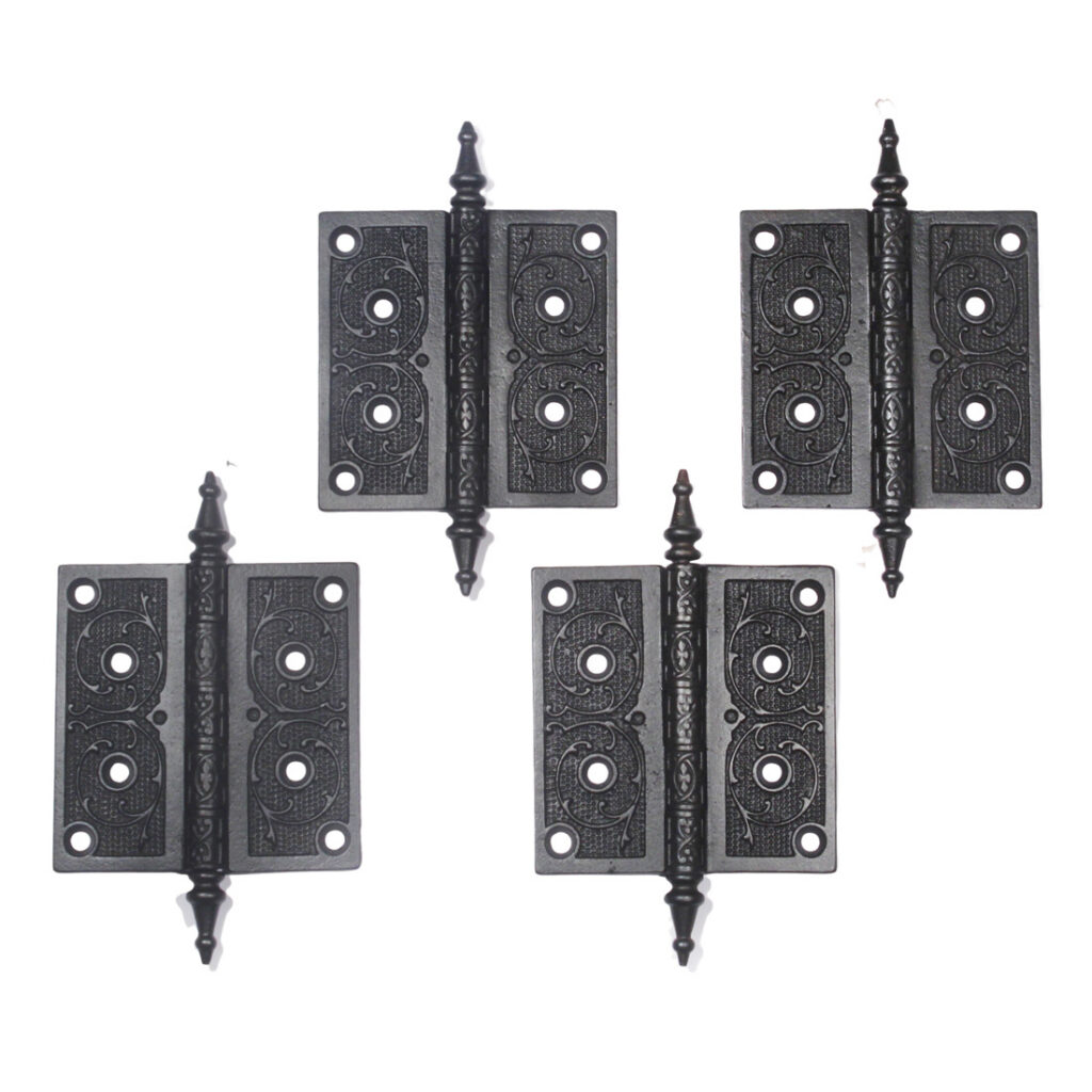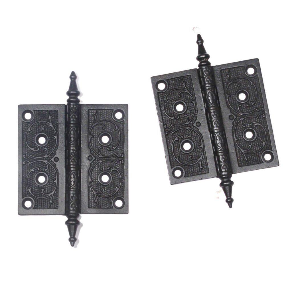 Matching pairs of antique cast iron hinges with steeple finials, dating from the 1880’s. Each hinge features a wonderful flowing design, and are each in very good condition. They each measure 4-1/2” by 4-1/2” (not counting the finials.) THE PRICE LISTED IS FOR A PAIR OF HINGES (2 HINGES).