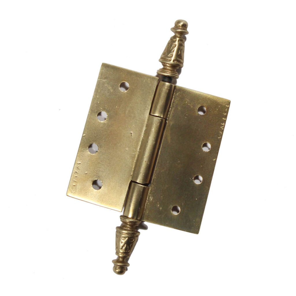 Beautiful matching pairs of vintage brass decorative hinges with steeple finials. Each hinge is ornamented with a stylized geometric design, and is in very good condition with a brass finish. They each measure 3-1/2” by 3-1/2″ (not counting the finials). THE PRICE LISTED IS FOR EACH PAIR OF HINGES. If ordering multiple items, please contact us for a combined shipping quote.