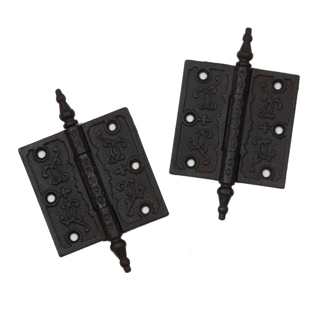 A splendid pair of antique cast iron Eastlake 3-1/2” hinges with steeple finials. Dating from the 19th century, each hinge is ornamented with an elegant design of volutes and a textural background. These hinges are in very good condition with a darkened finish. Each hinge measures 3-1/2” wide by 3-1/2” tall (not counting the finials.). THE PRICE LISTED IS FOR A PAIR OF HINGES.