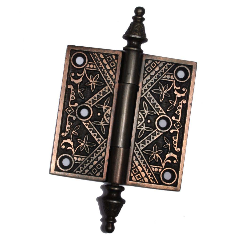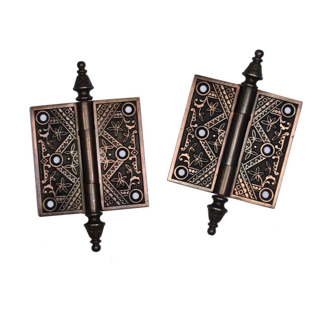 A splendid pair of antique cast iron Eastlake 4” hinges with steeple finials and their original bronze wash. Dating from the 19th century, each hinge is ornamented with an intricate geometric design of stylized foliates. These hinges are in very good condition with a bronze wash finish. Each hinge measures 4” wide by 4” tall (not counting the finials.). THE PRICE LISTED IS FOR A PAIR OF HINGES.