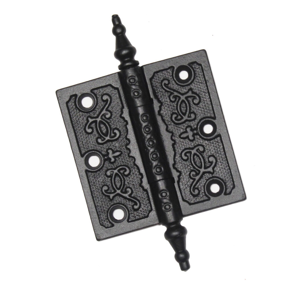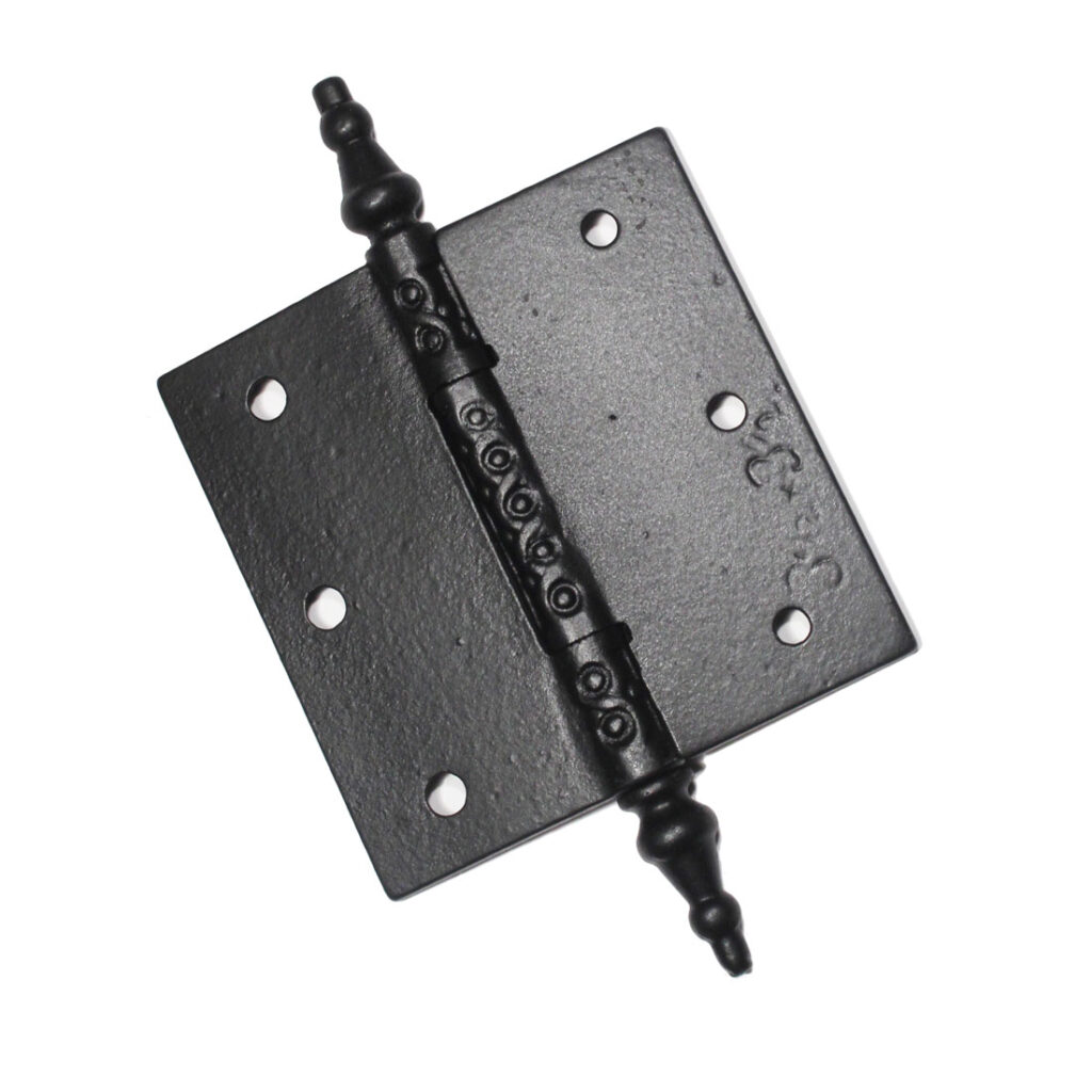 Elegant pair of antique cast iron decorative hinges with steeple finials. Dating from the 19th century, each hinge is ornamented with a flowing design, and are in very good condition with a darkened finish. Each hinge measures 3-1/2” wide by 3-1/2” tall (not counting the finials). If ordering multiple items, please contact us for a combined shipping quote.