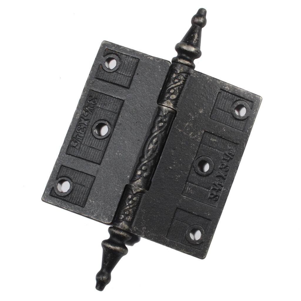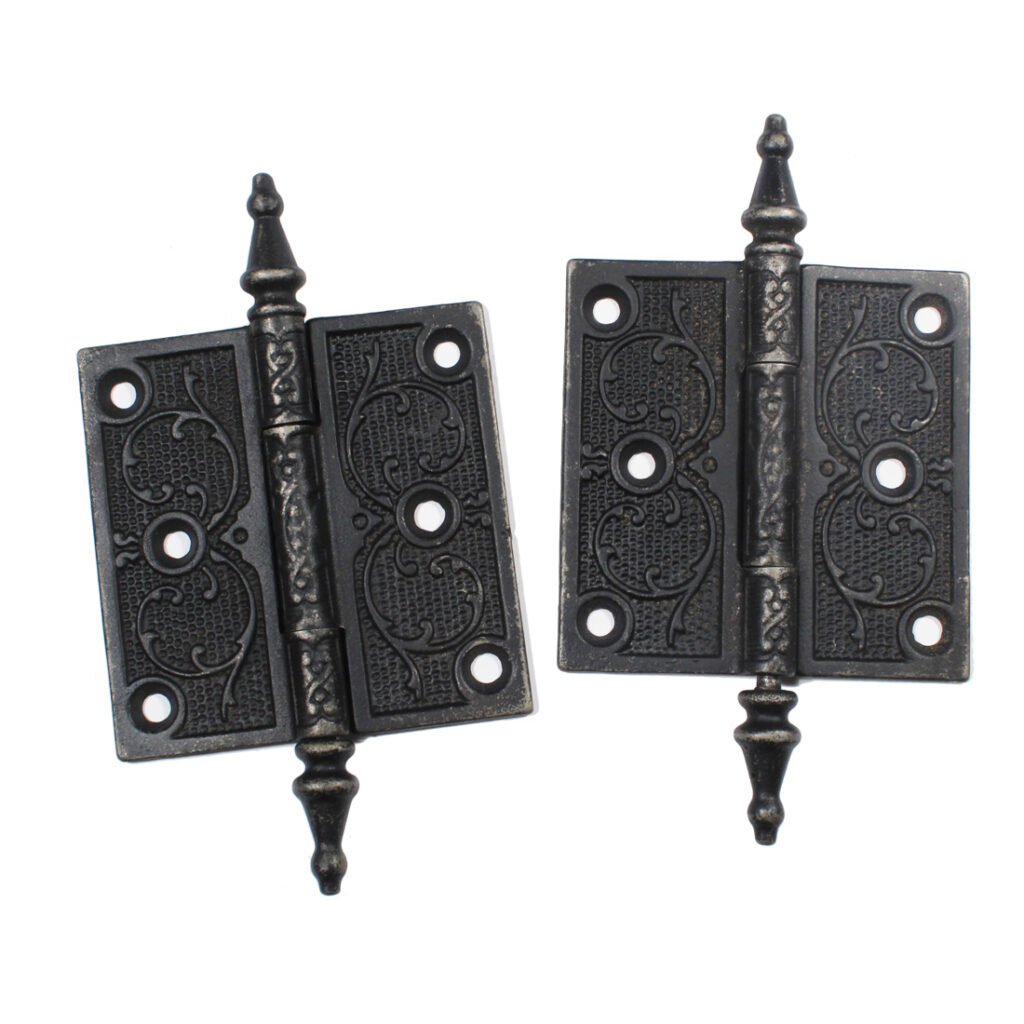 Elegant pair of antique cast iron decorative hinges with steeple finials. Dating from the 19th century, each hinge is ornamented with a flowing design, and are in very good condition with a darkened finish. Each hinge measures 3-1/2” wide by 3-1/2” tall (not counting the finials).