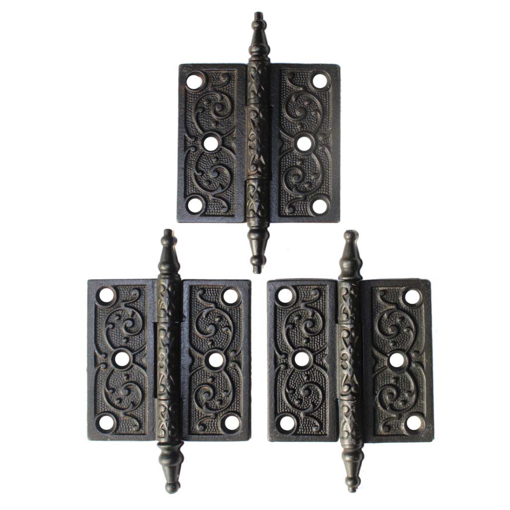 A matching set of 3 antique cast iron hinges with steeple finials, dating from the 1880’s. Each hinge features a wonderful design of swirling volutes, and are each in very good condition. They each measure 3-1/2” by 3-1/2” (not counting the finials.) THE PRICE LISTED IS FOR A SET OF 3 HINGES.