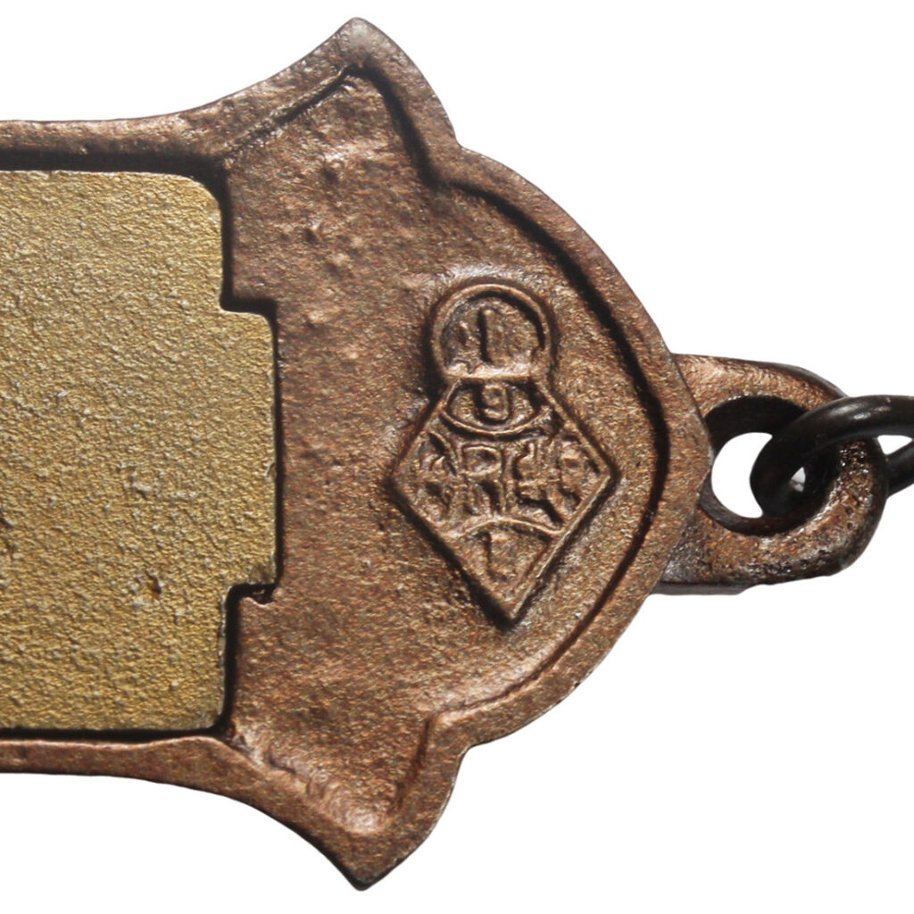 A stunning antique surface mount decorative head bolt & catch for a door by Russell & Erwin, dating from the late 1800’s. This “New Old Stock” spring-loaded cast iron Eastlake chain bolt is in excellent antique condition, and functions very nicely. The head bolt measures 6-1/8” long, 2-3/8″ wide, and has a 3/4″ projection; the catch measures 2-3/8″ tall, 2-3/8″ wide, and projects 3/4″; the chain extends 24″.