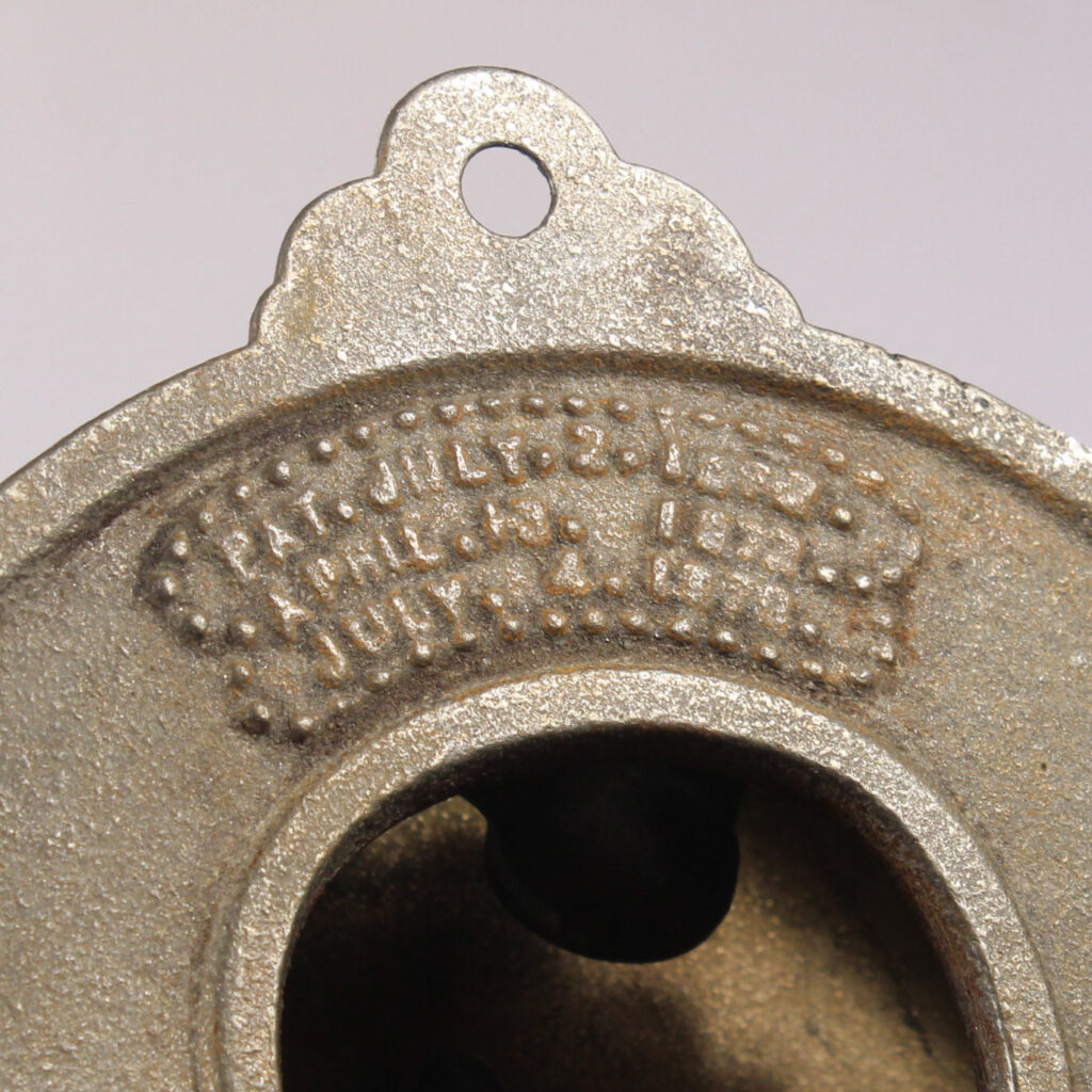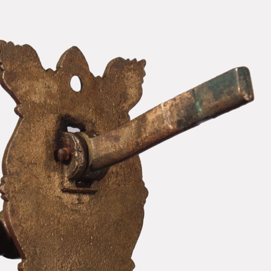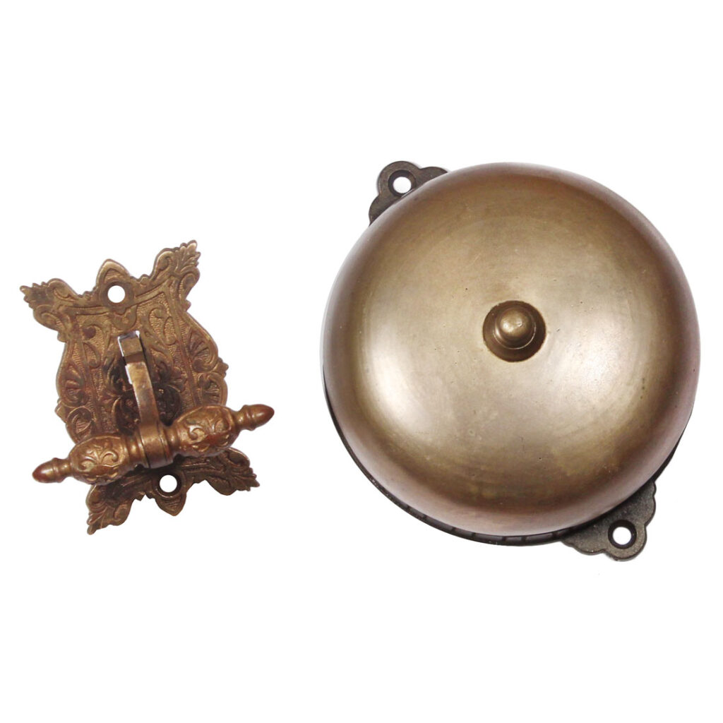 An incredible antique mechanical door bell with a decorative bronze lever, dating c.1872. This doorbell is in excellent antique condition with a beautiful aged patina. The bell measures 5″ wide, and projects 3″; the distance between screw-holes is 5-3/8″. The lever and plate measures approx. 2-1/4” wide, 3-1/4” tall, and projects 1-3/4”. If ordering multiple items, please contact us for an accurate shipping quote.