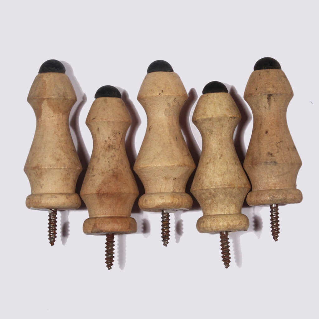 Matching antique “New Old Stock” wood door stops. Each stop is in excellent antique condition, and measures 1-1/8″ wide by 2-3/4″ deep; the screw projects 5/8″. If ordering multiple items, please contact us for a combined shipping quote. THE PRICE LISTED IS FOR EACH DOOR STOP.