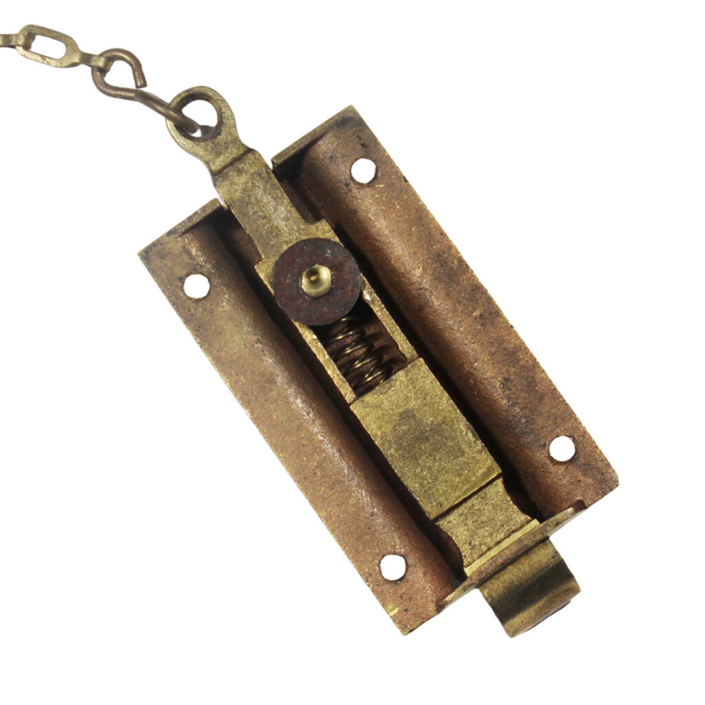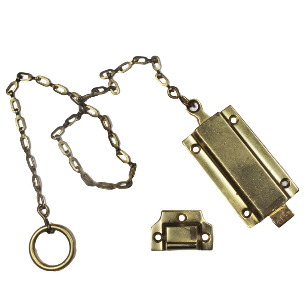 A darling “New Old Stock” antique surface mount brass head bolt for a door. This spring-loaded brass head bolt functions very nicely and has a lovely brass finish. The latch body measures 3” long, 1-3/4″ wide, and has a 1/2″ projection; the catch piece measures 1-1/8″ long, 1-5/8″ tall, and projects 3/4″; the chain is 21″ long. If ordering multiple items, please contact us for a combined shipping quote.