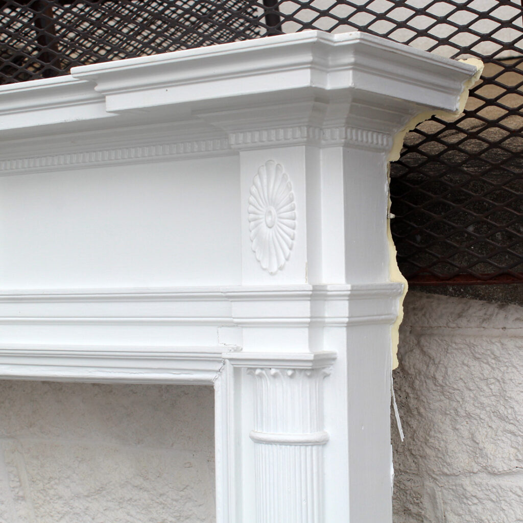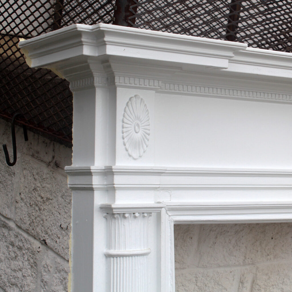 A lovely antique Neoclassical fireplace mantel with decorative details, c. 1900, from a home in Franklin, TN. This mantel is in very good antique condition with the chips and scratches typical of an old mantel; there is a non-functional outlet cut out of the mantel shelf (as pictured). It measures 72” wide, 53-1/2” tall, and has a 11-1/2″ projection; the firebox opening is 47-1/4” wide and 39-1/2″ tall. This piece requires a custom shipping quote; please contact us if you have any questions.