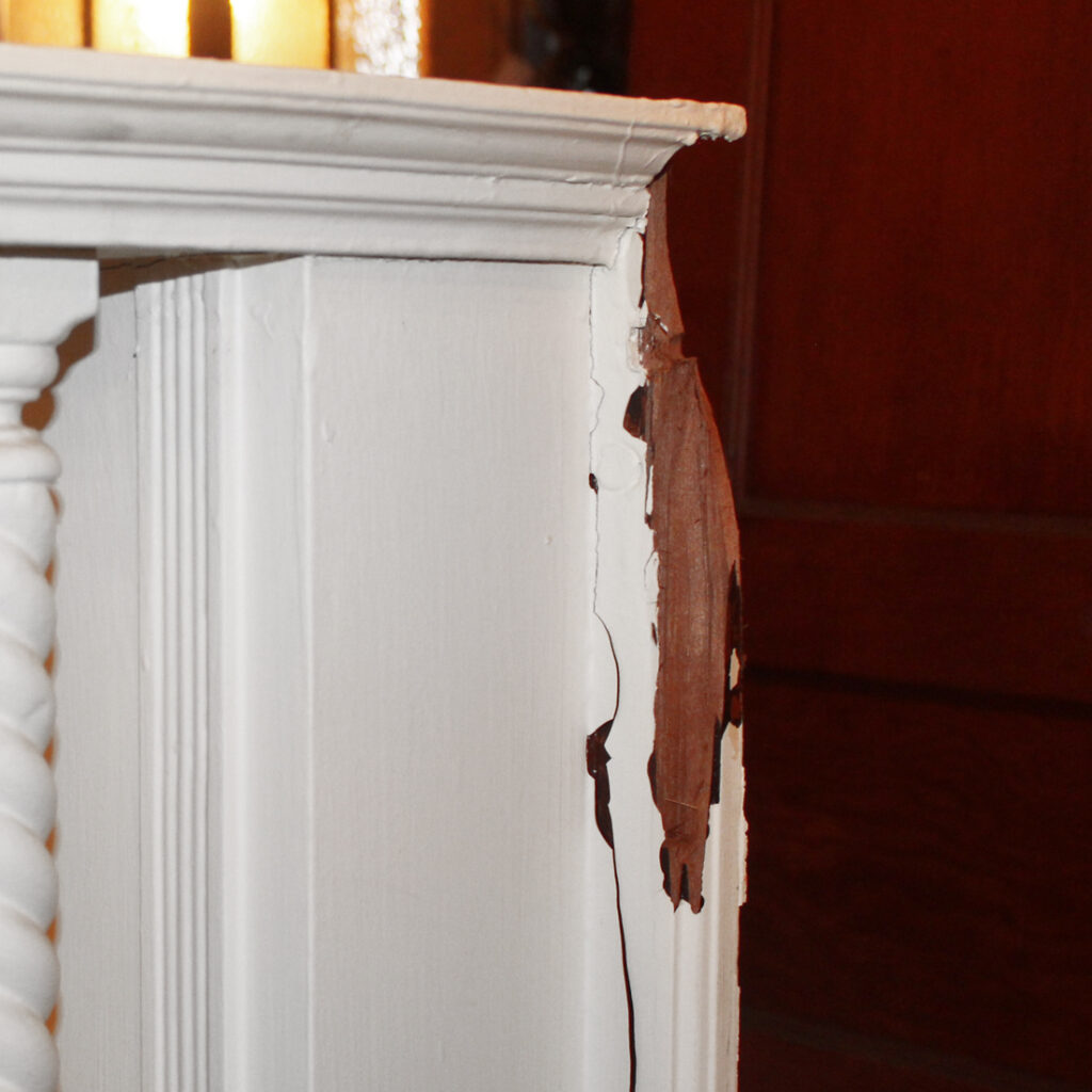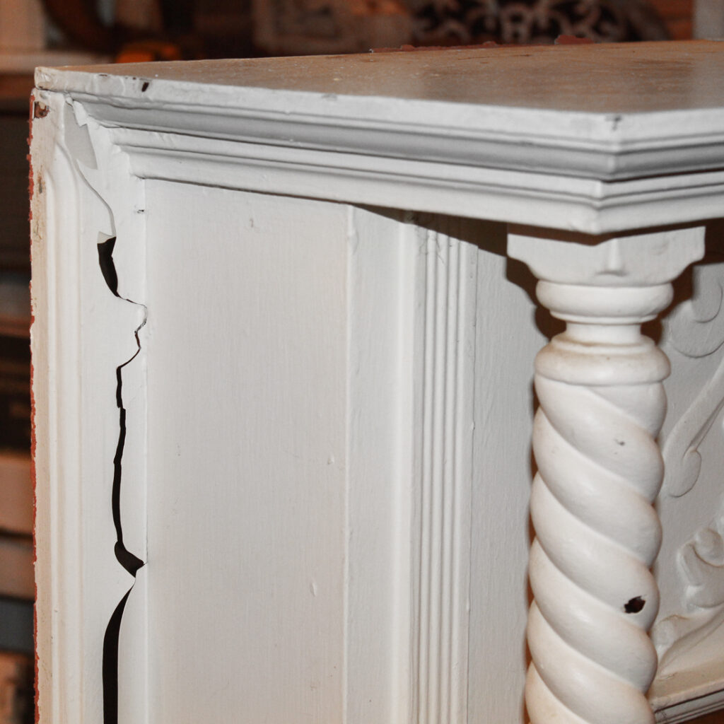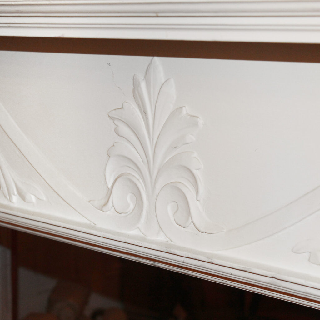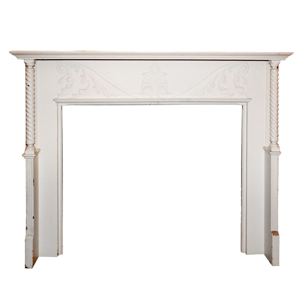 An elegant antique cherry fireplace mantel with lovely decorative detailing, salvaged from a house in Nashville, TN and dating from the early 1900s. This fireplace mantel is in good antique condition with the expected wear including a missing piece on the side (pictured), and has playful chippy paint finish. It measures approximately 60-1/8″ wide, 47-5/8″ tall, and 12” deep; the firebox opening is approximately 41-1/2″ wide, 35-1/2″ tall. This piece requires a custom shipping quote, please contact us if you have any questions.