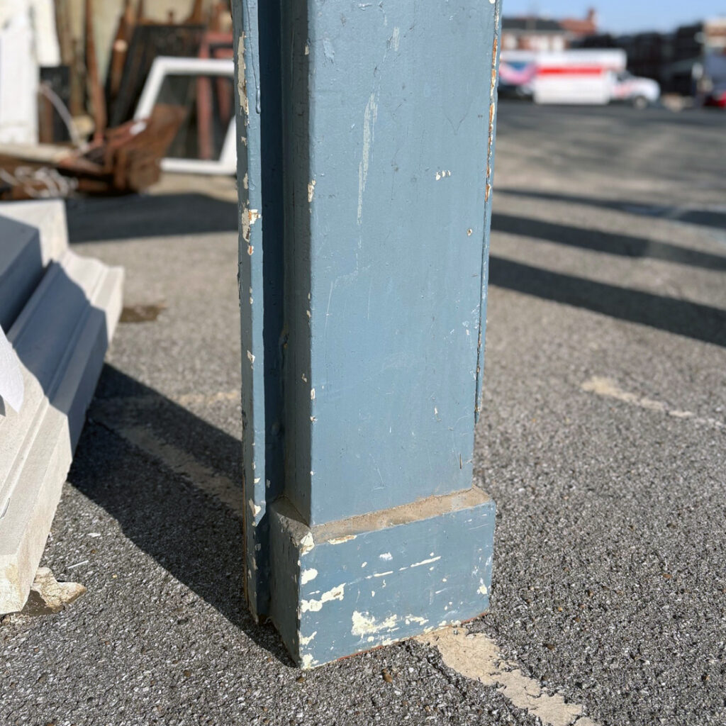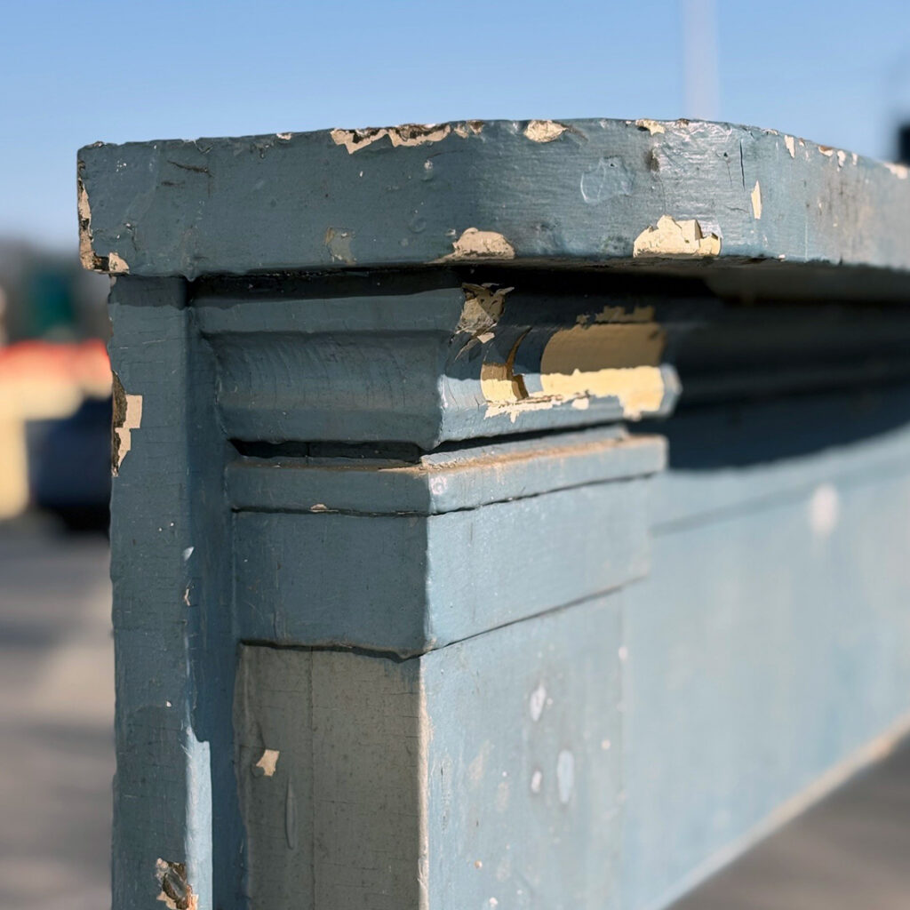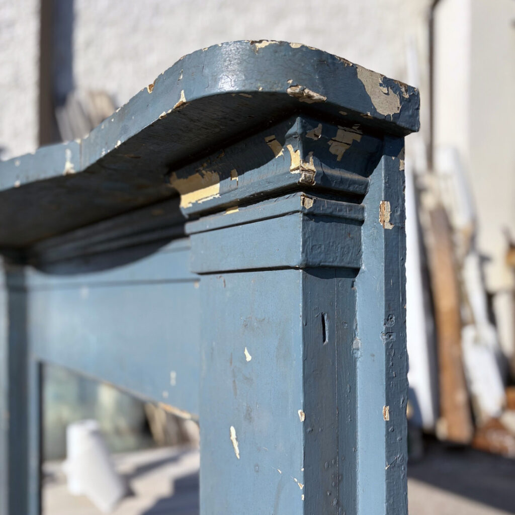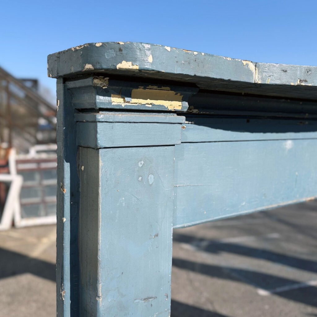 A fabulous antique fireplace mantel, dating from the 19th century, and salvaged out of a home in Nashville, TN. The mantel is in good antique condition with the expected wear, nicks, and chips, and is painted a playful blue (as pictured) It measures 71″ wide, 53″ tall and 12-1/2″ deep, and has a firebox opening of approximately 46″ wide and 36″ tall. This piece requires a custom shipping quote; please contact us if you have any questions.