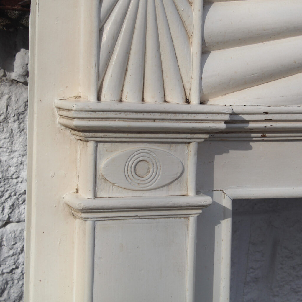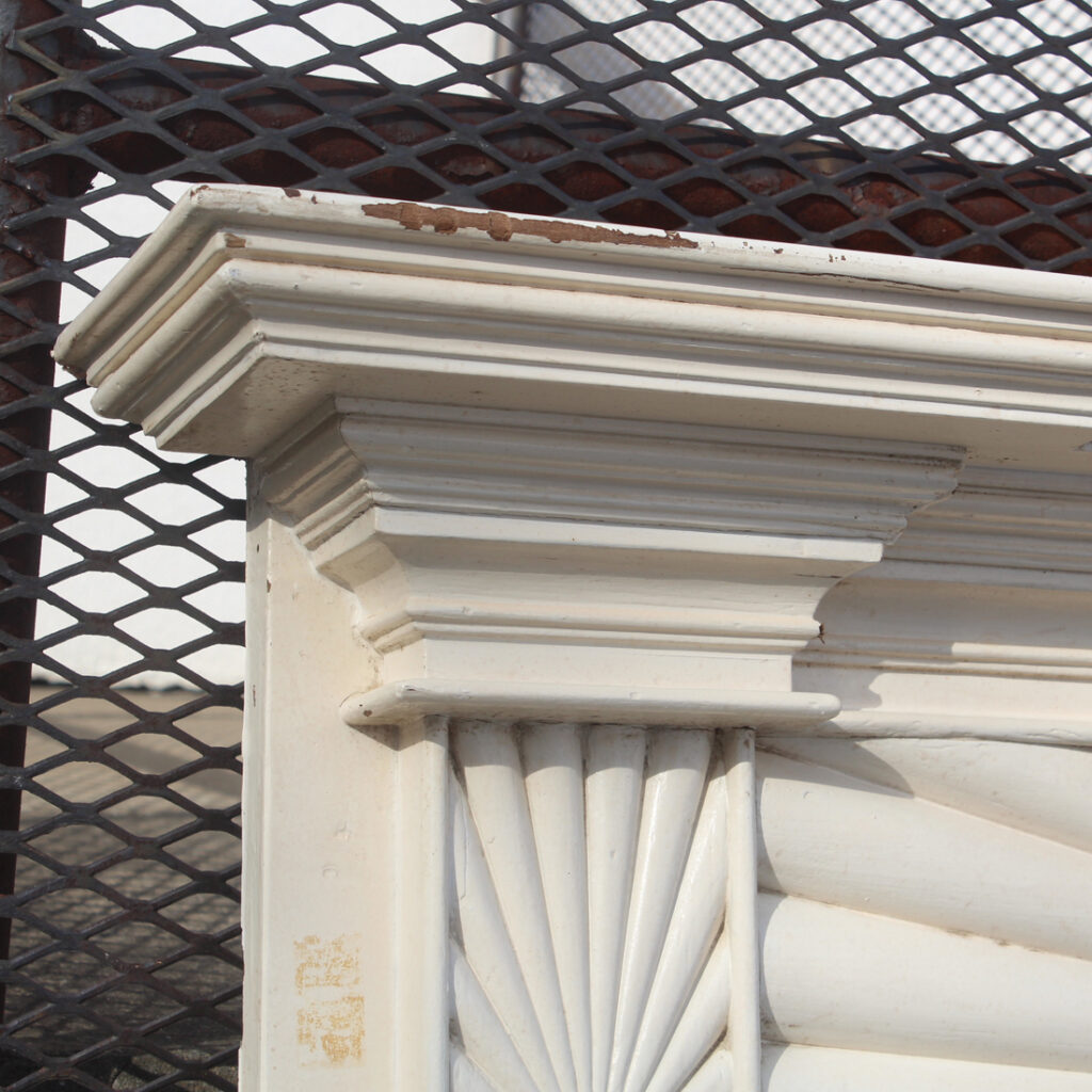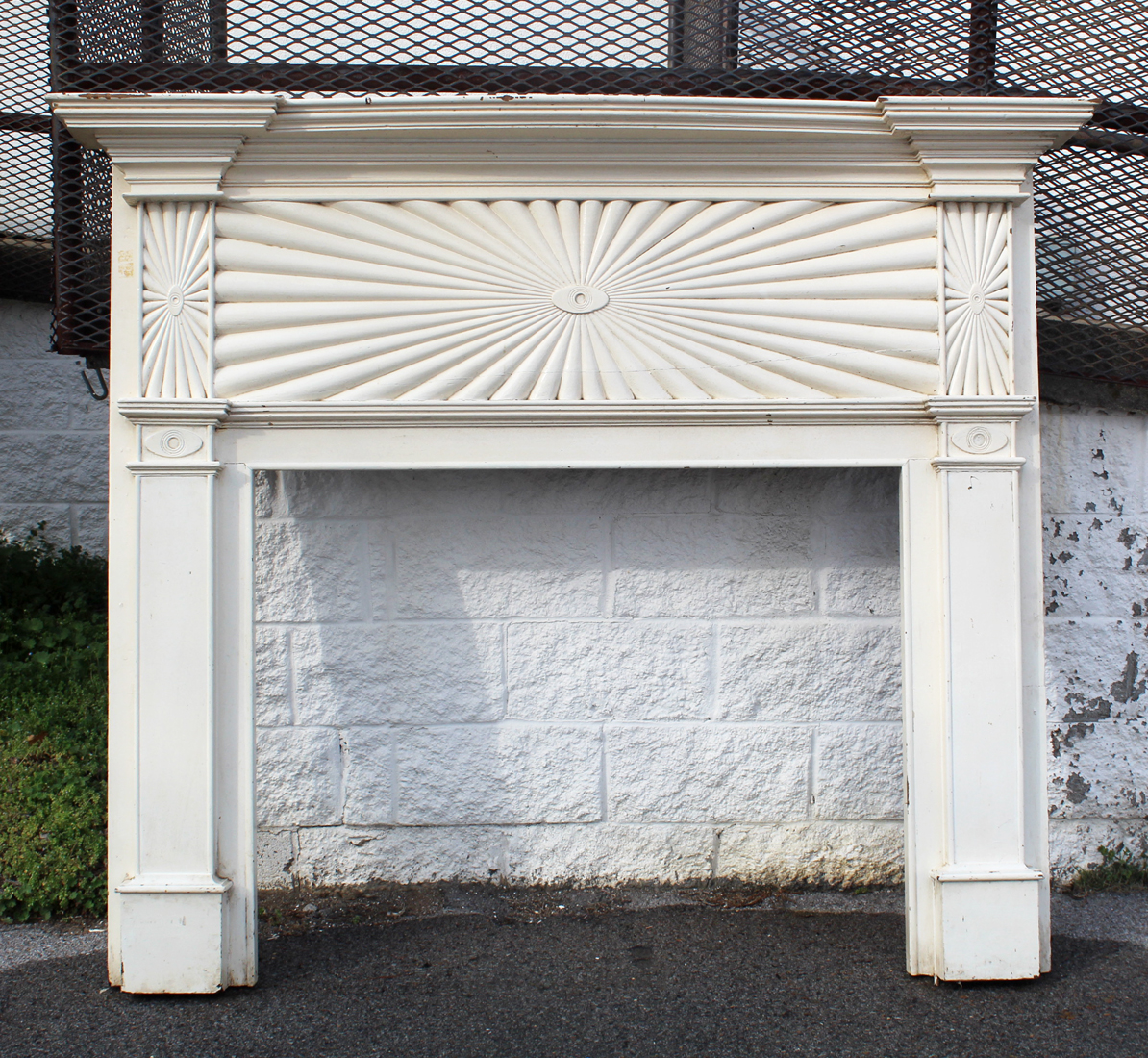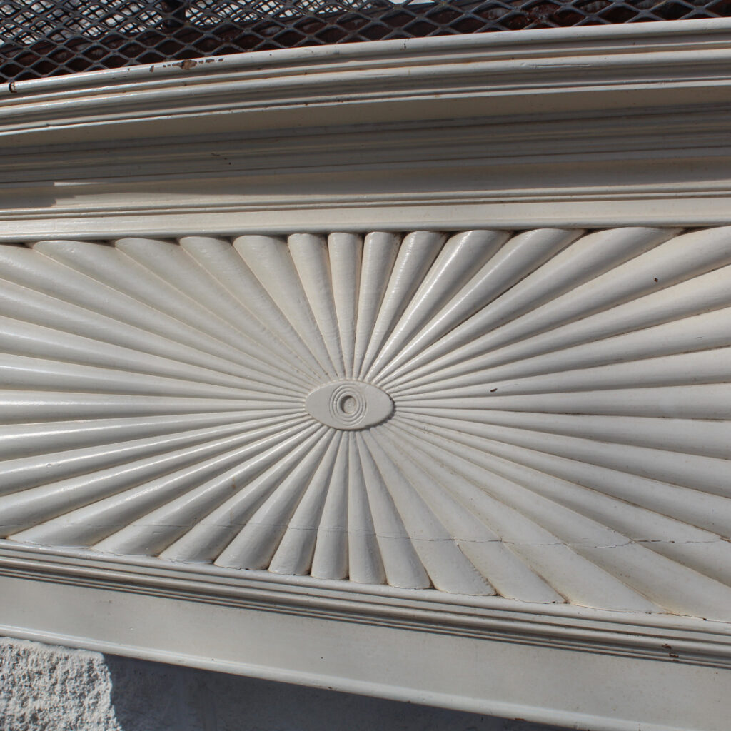 An incredible antique Federal fireplace mantel, dating from the 1820’s and salvaged from a home in Kentucky. This elegant antique fireplace mantel features a striking carved frieze with a dramatic radiating sunburst motif that spans the full width of the header. The design centers on a carved oval medallion, with finely fluted rays extending outward to create a bold architectural focal point.