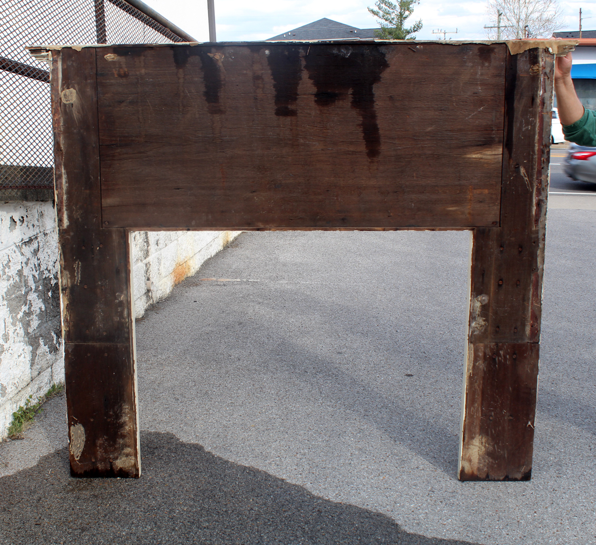 The mantel is in very good condition and measures 71-1/4″ wide, 62″ tall and 8″ deep; the firebox opening measures approximately 45-1/4″ wide and 37″ tall. This piece requires a custom shipping quote; please contact us if you have any questions.