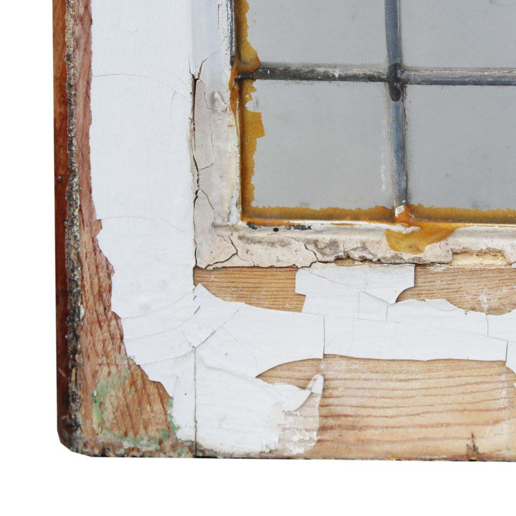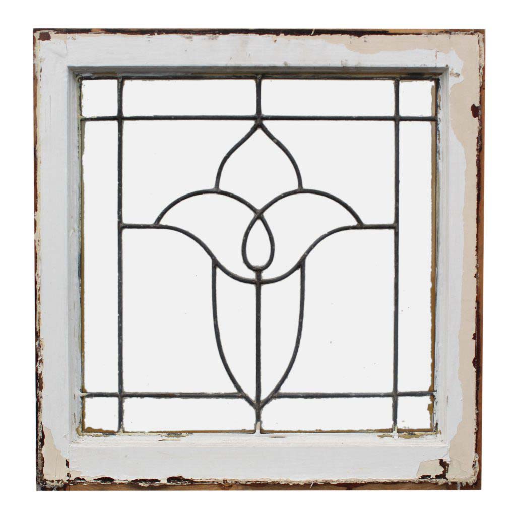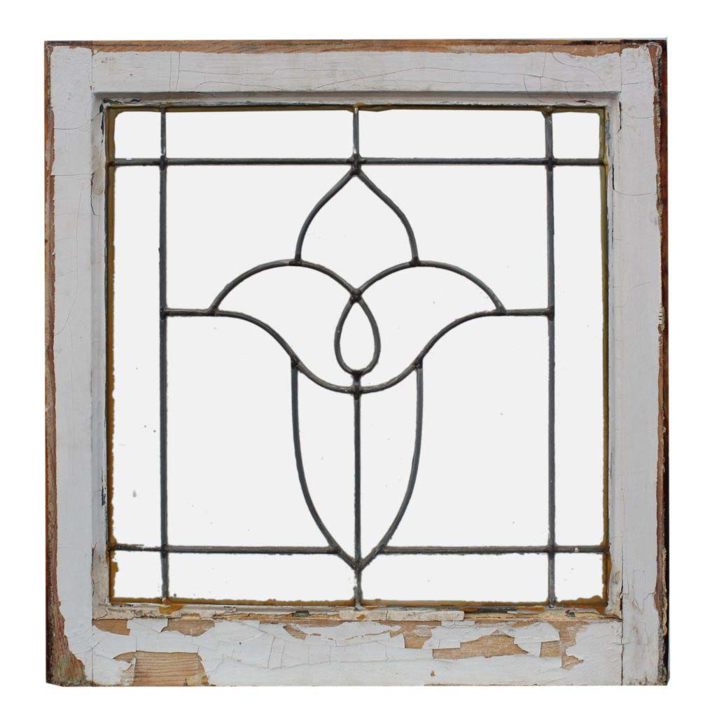 Splendid antique American leaded glass windows, dating from the early 1900’s. These clear glass windows feature a background of clean lines with a beautiful stylized flower in its center. Each window is in very good condition; the wooden frame has a chippy, painted finish on both sides and is missing some of its stops (as pictured). Each window measures 24” wide by 25″ tall; the glass measures 19-1/2″ wide by 19-1/2″ tall. THE PRICE LISTED IS FOR EACH WINDOW. This piece requires a custom shipping quote; please contact us if you have any questions.