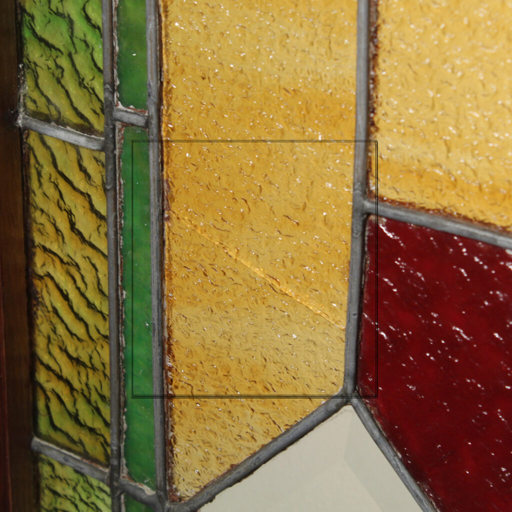 Stunning antique American stained glass window, dating from the early 1900’s. The window features a playful geometric design with different hues of colored glass and clear beveled glass. The window is in good antique condition, as pictured. The window measures 22-1/4″ wide by 33″ tall, and the glass measures 18″ wide by 28″ tall. This piece requires a custom shipping quote; please contact us if you have any questions.