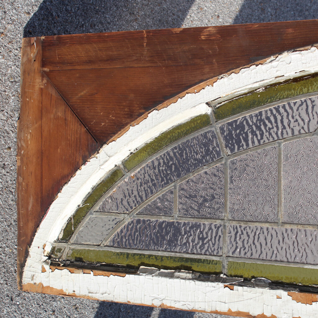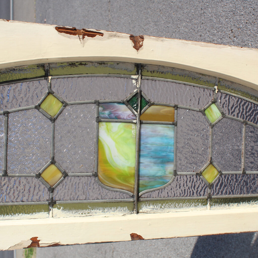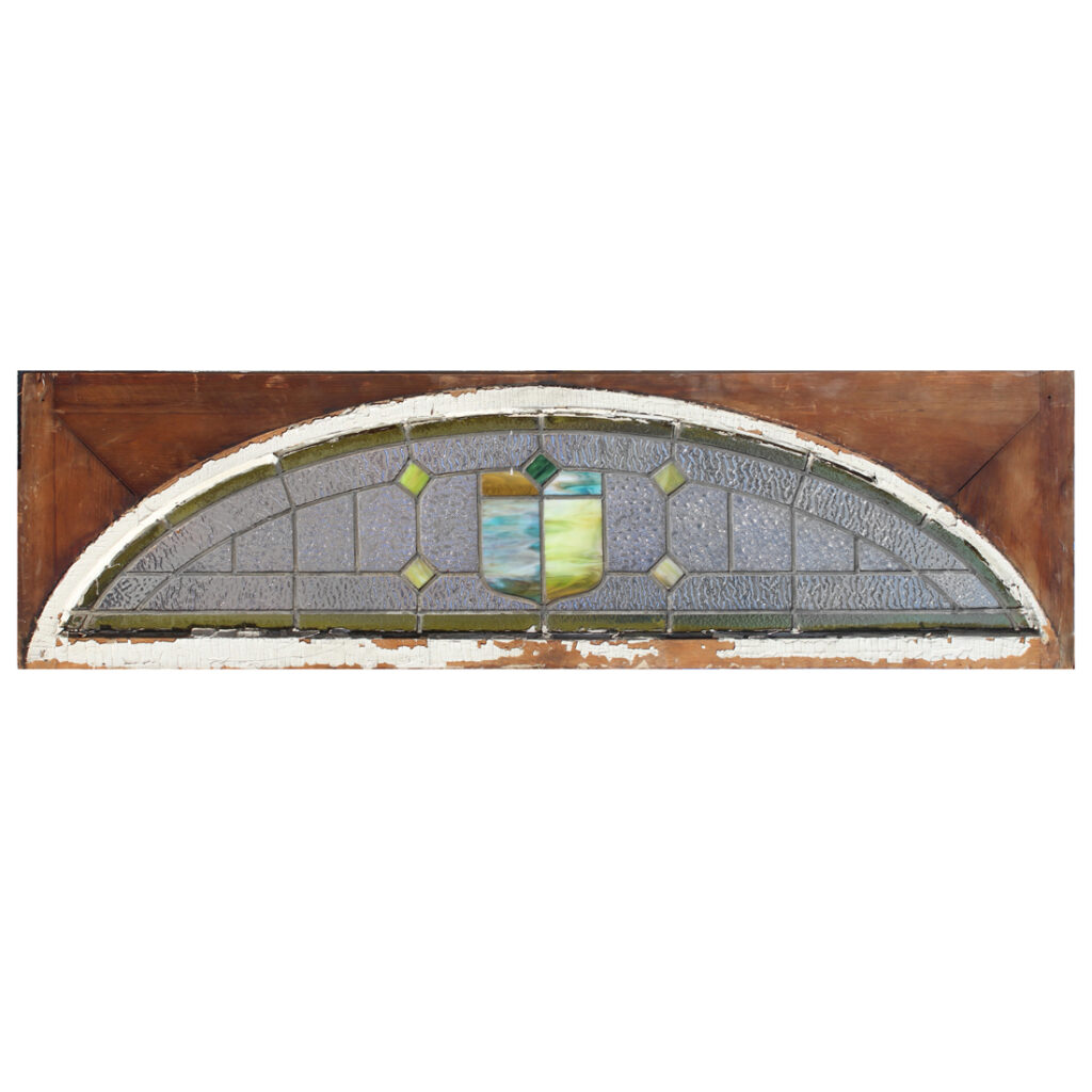 A darling antique American arched stained glass window transom, dating from the early 1900s. This window features an array of textured and colored glass, with a fabulous stylized shield motif at its center. The window is in good antique condition, and the glass is in very good condition with no cracks or breaks (as pictured). The window measures 64-1/4” wide, 18” tall and 1-3/8″ thick. This window requires a custom shipping quote; please contact us if you have any questions.