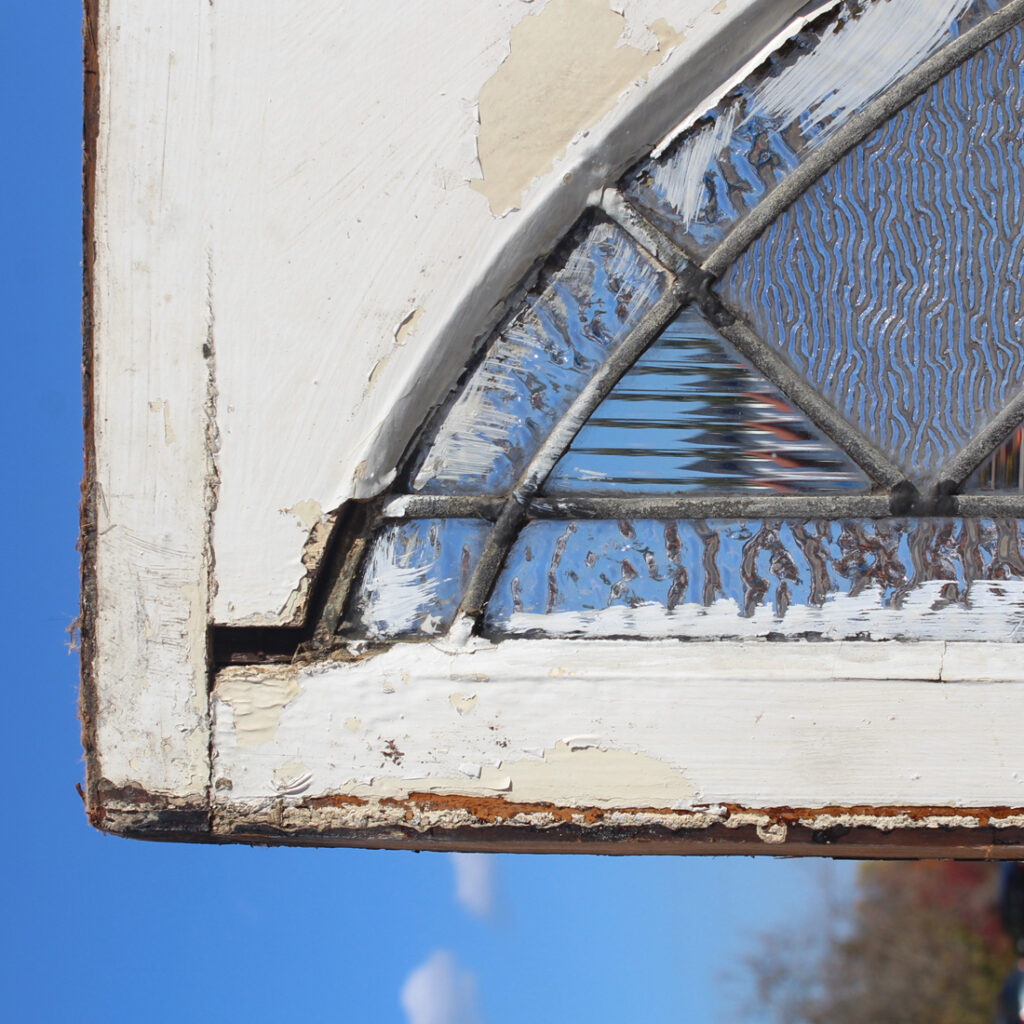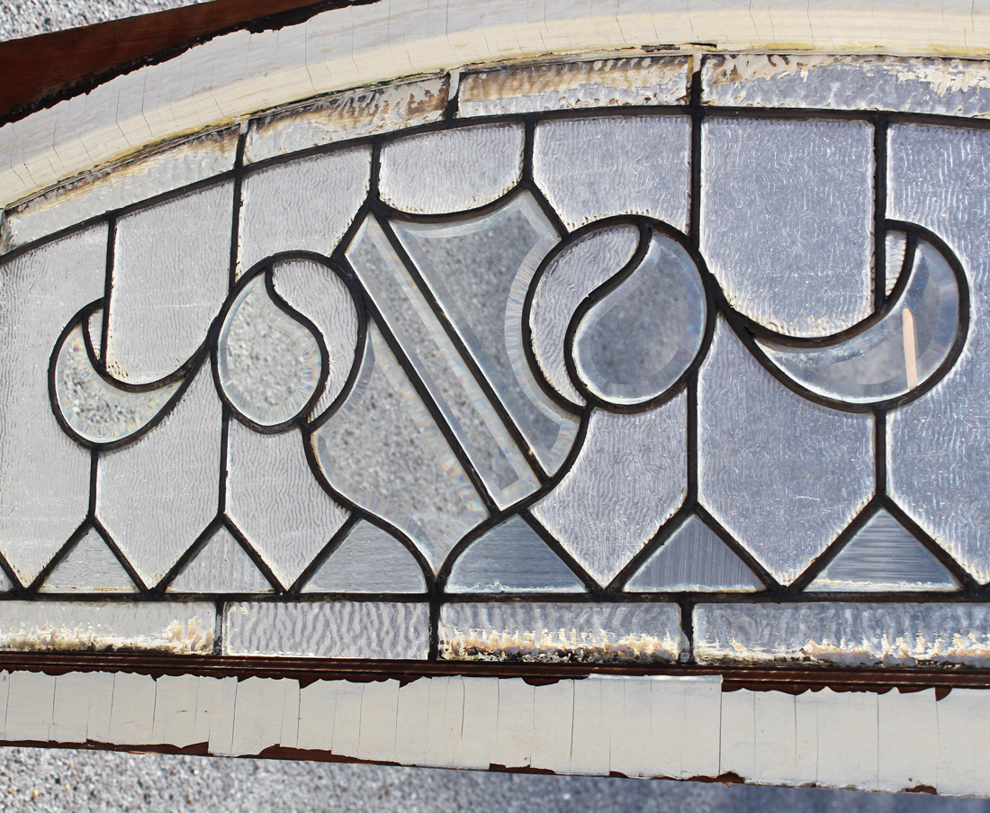 A lovely antique American arched leaded glass window transom, dating from the early 1900s. This window features an array of textured and beveled glass, with a fabulous shield motif at its center. The window is in good antique condition, and the glass is in very good condition with no cracks or breaks (as pictured). The window measures 64” wide, 18” tall and 1-3/8″ thick. This window requires a custom shipping quote; please contact us if you have any questions.