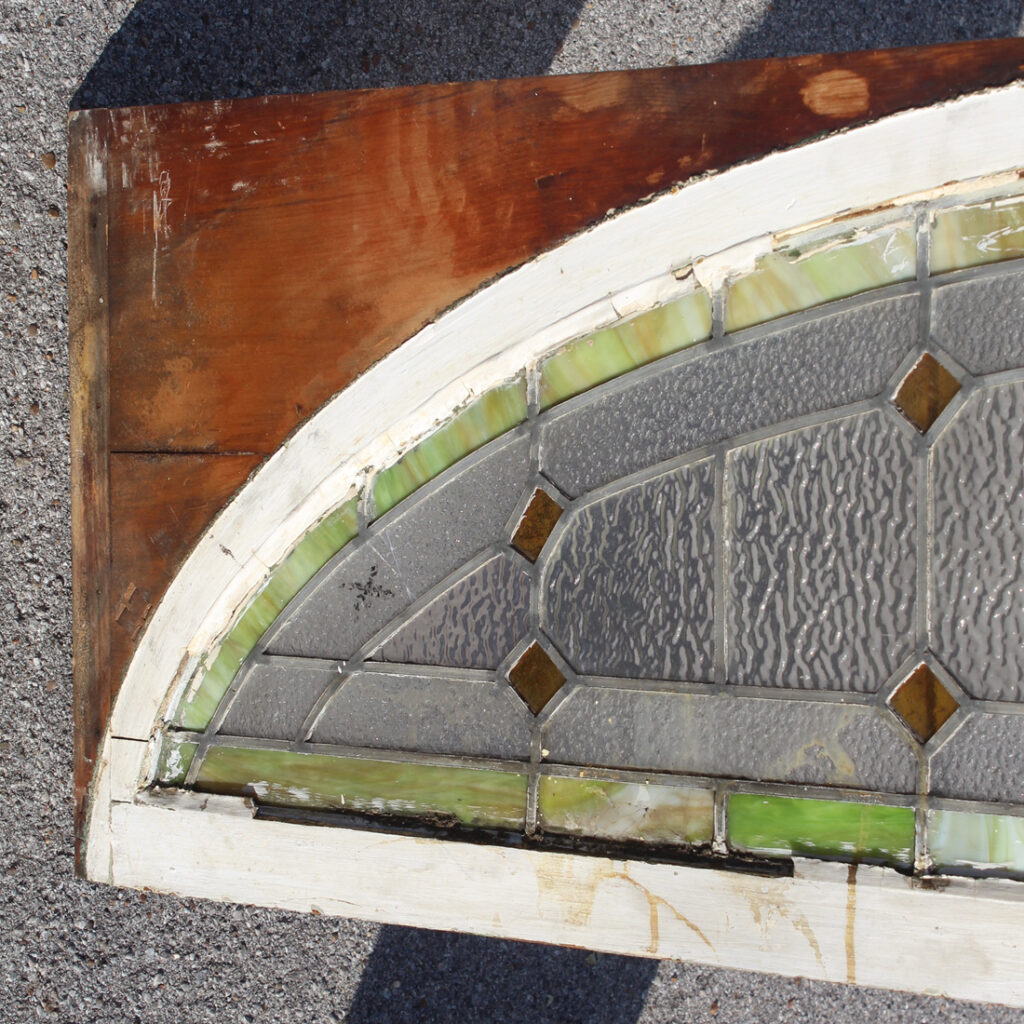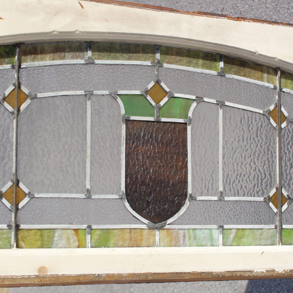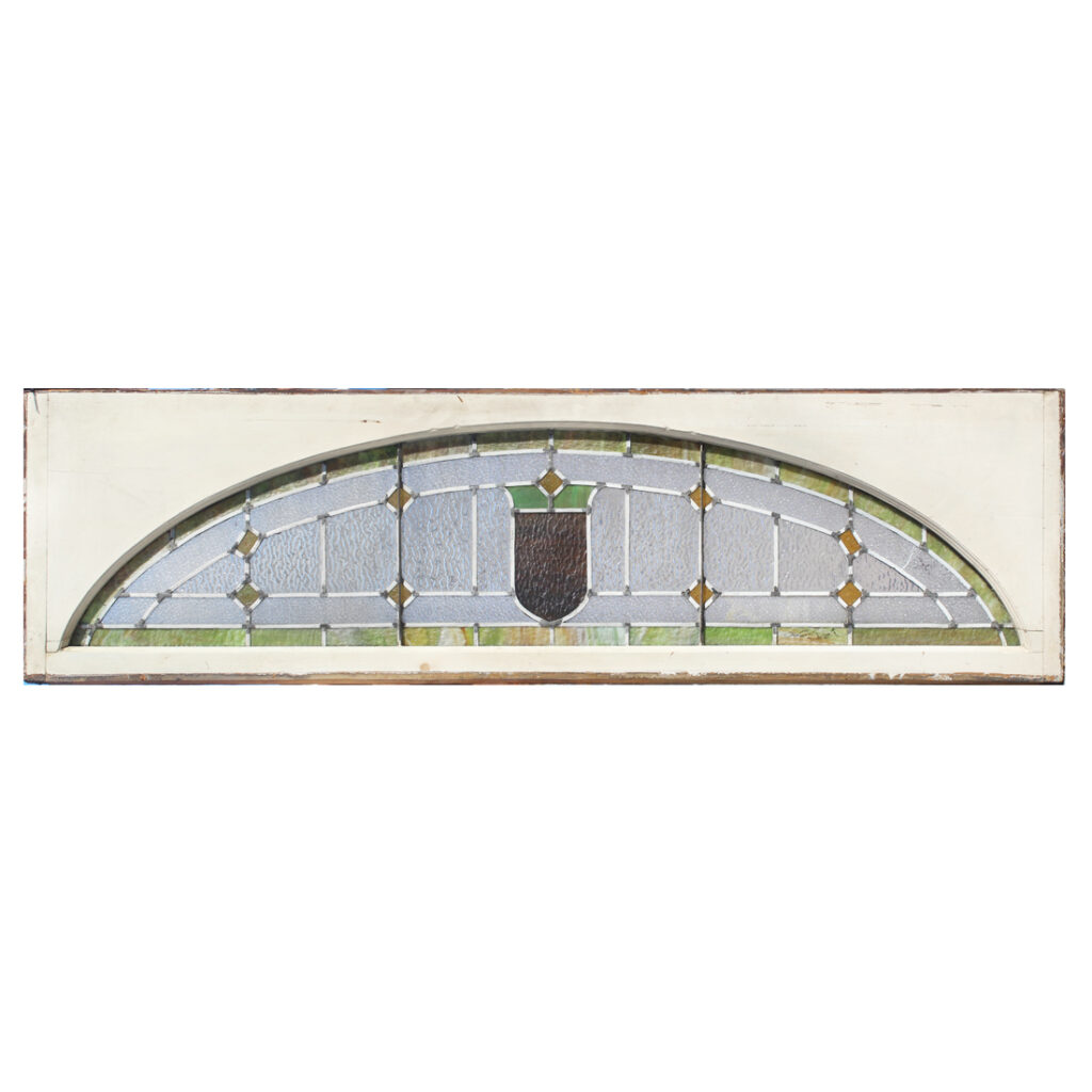 A fabulous antique American arched stained glass window transom, dating from the early 1900s. This window features an array of textured and colored glass, with a fabulous stylized shield motif at its center. The window is in good antique condition, and the glass is in good condition with a small crack which does not detract from the beauty of the fixture (as pictured). The window measures 64-1/2” wide, 18” tall and 1-3/8″ thick. This window requires a custom shipping quote; please contact us if you have any questions.