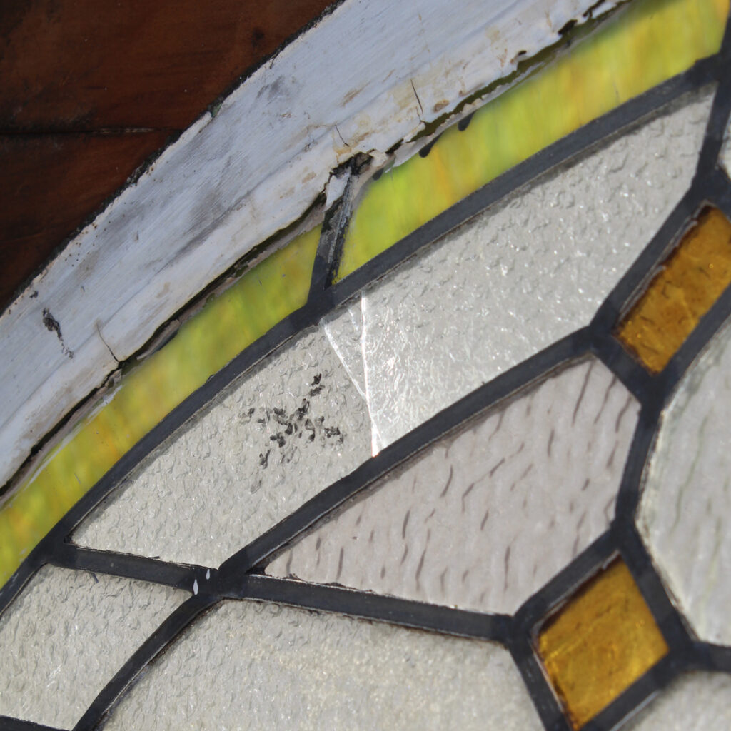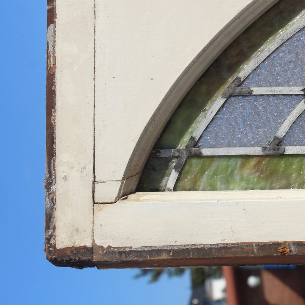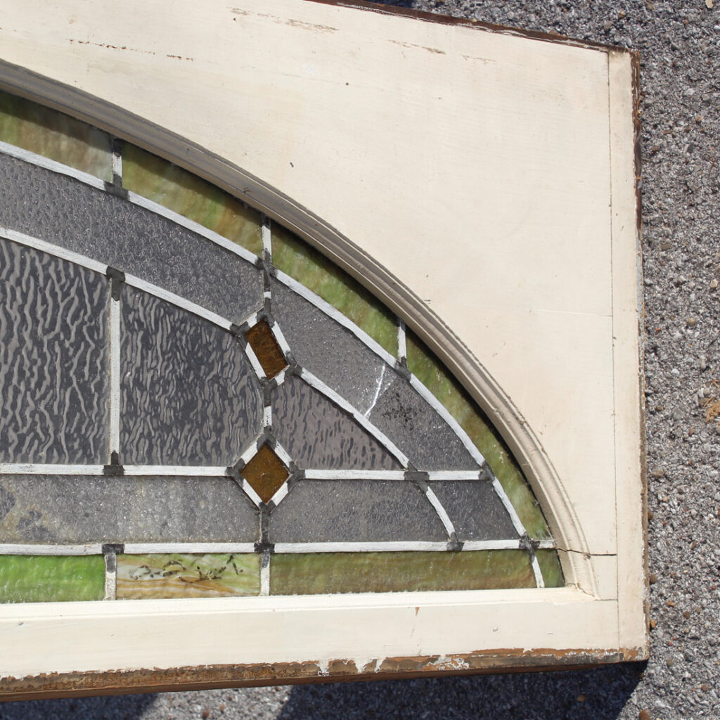 A fabulous antique American arched stained glass window transom, dating from the early 1900s. This window features an array of textured and colored glass, with a fabulous stylized shield motif at its center. The window is in good antique condition, and the glass is in good condition with a small crack which does not detract from the beauty of the fixture (as pictured). The window measures 64-1/2” wide, 18” tall and 1-3/8″ thick. This window requires a custom shipping quote; please contact us if you have any questions.