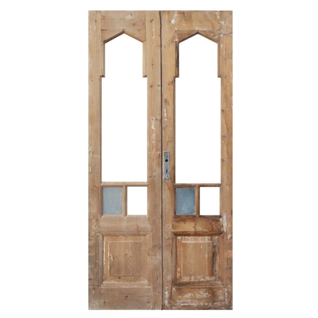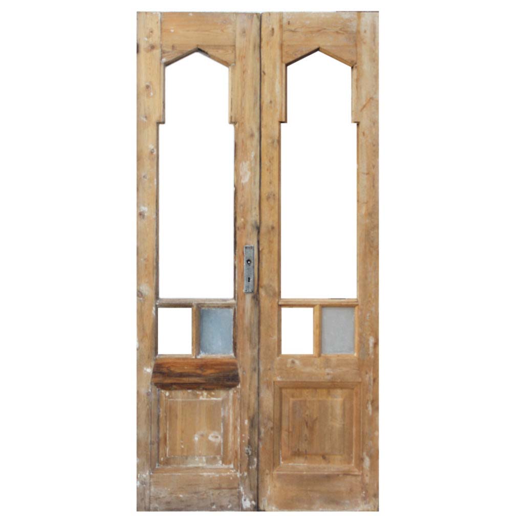 An exquisite pair of antique double doors with stylized Gothic arch windows, dating from the early 1900’s. This door pair is in very good antique condition with the expected wear typical of an old door, and is missing its glass (as pictured). The doors collectively measure 41-5/8″ wide, 84-3/4” tall and 1-7/8” thick. These doors require a custom shipping quote; please contact us if you have any questions.
