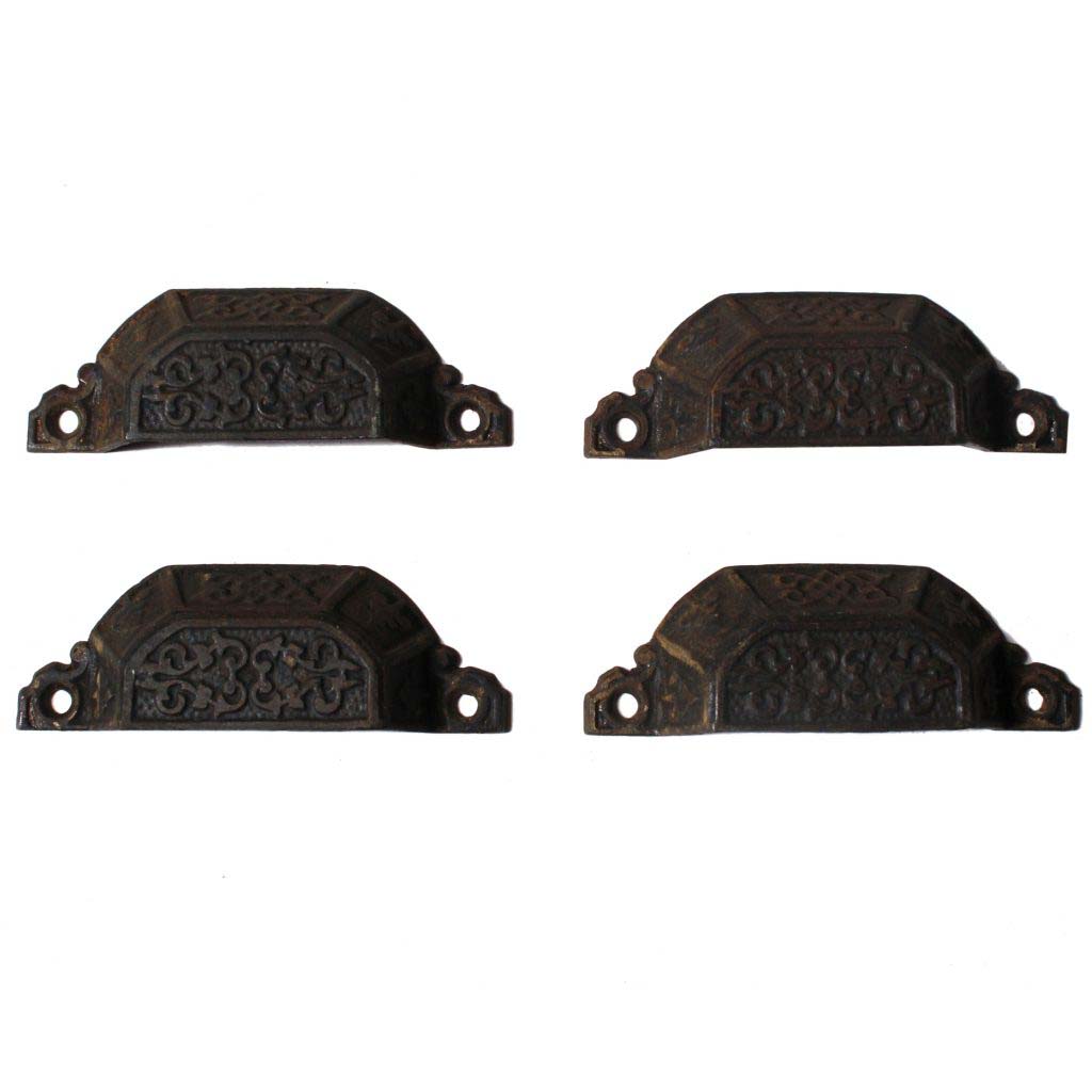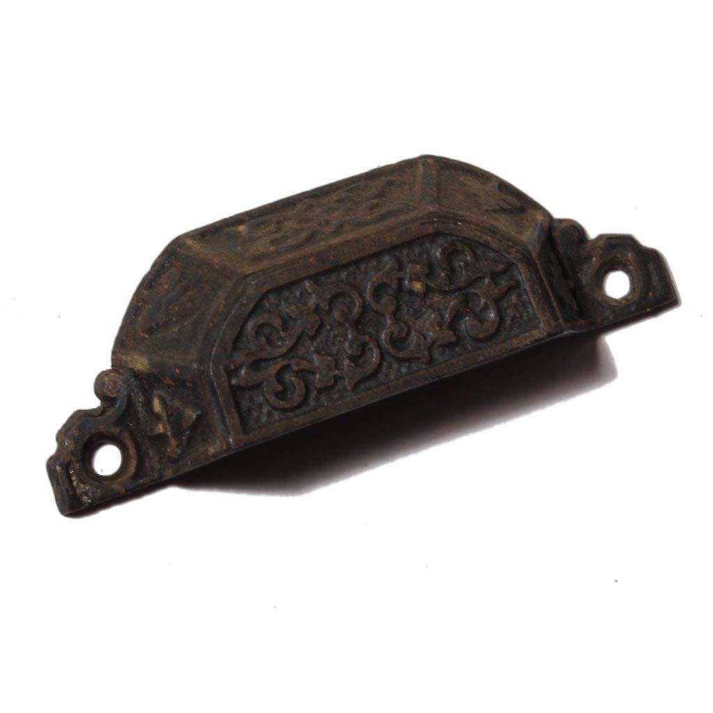 Lovely antique cast iron bin pulls, dating from the late 1800’s. These pulls feature a playful design with geometric details. The Eastlake bin pulls are in excellent condition with a darkened patina. Each handle measures 3-5/8” wide and 1-1/4” tall, projects 1/2″; the space from hole to hole is 3”. THE PRICE LISTED IS FOR EACH BIN PULL.
