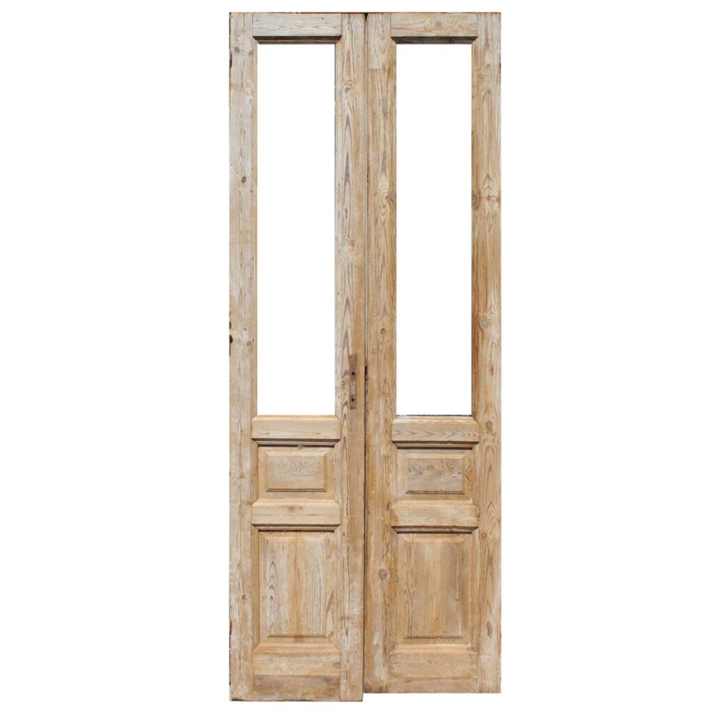 An understated pair of antique French double doors, dating from the early 1900s. Each door features a half view window perched above a raised wood panels below. These double doors are in very good antique condition with a wonderful stripped wood finish. The doors include some of their non-functional hardware, and have all of the dings and scratches typical of an old door; the doors are slightly cut uneven, and each door is missing its glass as pictured. They measure 39” wide collectively, 97-3/4″ tall, and 1-7/8″ thick. These doors require a custom shipping quote; please contact us if you have any questions.