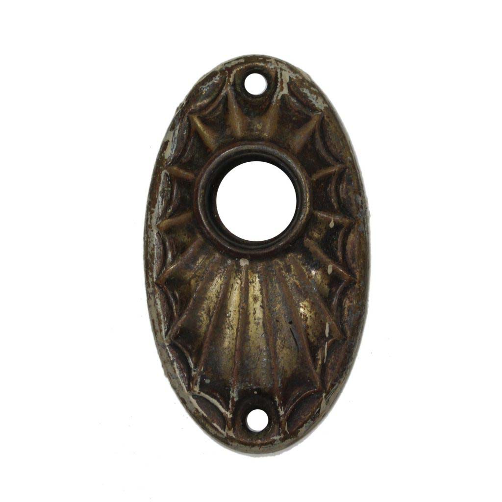 Matching antique brass door knob rosettes, dating from the early 1900s. Each oval door knob escutcheon features a decorative spider web design. The rosettes are in very good antique condition with varying patinas (as pictured). Each escutcheon measures 1-3/4” wide by 3” tall. THE PRICE LISTED IS FOR EACH ESCUTCHEON. At checkout, if ordering multiple items, please select FedEx shipping instead of Product-Based shipping to obtain an accurate shipping quote. The matching keyhole escutcheons are also available with item number NKC21-RW.